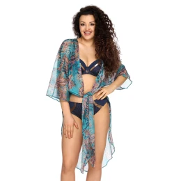 Lekkie, krótkie pareo 007 w całości zadrukowane egzotycznym printem na wyrazistym tle to wspaniałe uzupełnienie każdego stroju kąpielowego. Przyjemny dla ciała szyfon, z którego wykonano pareo oraz luźny półdługi rękaw i wysokie rozcięcia po bokach dają uczucie przewiewności. Przednie poły narzutki można związać na wysokości talii, tył pozostawiając zakrytym. Jedno okrycie – wiele możliwości!