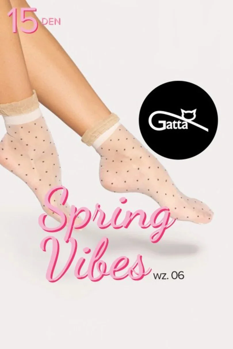Gatta Spring Vibes wz. 06 to wyjątkowe skarpetki 15 den, które łączą klasyczną subtelność z delikatnym błyskiem. Transparentna tkanina ozdobiona drobnymi, regularnymi kropeczkami i eleganckim, metalizowanym ściągaczem sprawia, że ten model jest idealnym dodatkiem zarówno do codziennych, jak i bardziej wyszukanych stylizacji. Wysoka zawartość elastanu gwarantuje elastyczność i komfort noszenia, a metalizowane włókno dodaje całości wyjątkowego uroku. To doskonały wybór dla kobiet, które cenią detale i modową świeżość.