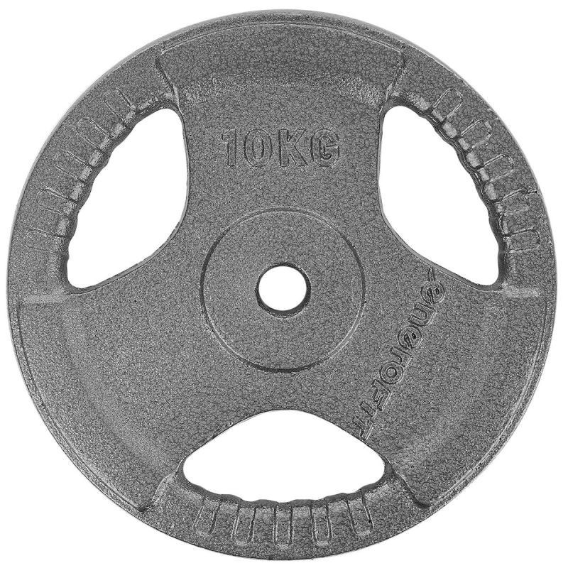 HAMMERTONOVÁ HMOTNOST 10 KG ENERO FIT fi26,5 je pevná tréninková deska vyrobená z litiny a opatřená odolným kladívkovým povrchem, který zvyšuje odolnost proti korozi a poškození. Díky třem ergonomickým úchytům umožňuje rychlé, bezpečné a pohodlné manévrování při tréninku nebo výměně desky na gripu. Univerzální průměr otvoru fi 26,5 mm umožňuje montáž na většinu standardních gripů, činek a závaží používaných v domácích posilovnách. Je nepostradatelnou součástí tréninkové sestavy pro začátečníky i pokročilé.