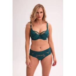 Pełne figi w odcieniu głębokiej zieleni to idealna propozycja dla kobiet ceniących komfort i elegancję w jednym. Model został wykonany z miękkiej mikrofibry oraz zmysłowej koronki z florystycznym motywem, która subtelnie oplata biodra i pośladki. Fason z wyższym stanem doskonale układa się na sylwetce, delikatnie modelując jej linie. Szeroki pas zapewnia stabilność i wygodę, a transparentne wstawki z koronki dodają lekkości i romantycznego charakteru. To figi, które łączą w sobie codzienną funkcjonalność z wyjątkowym wyglądem.