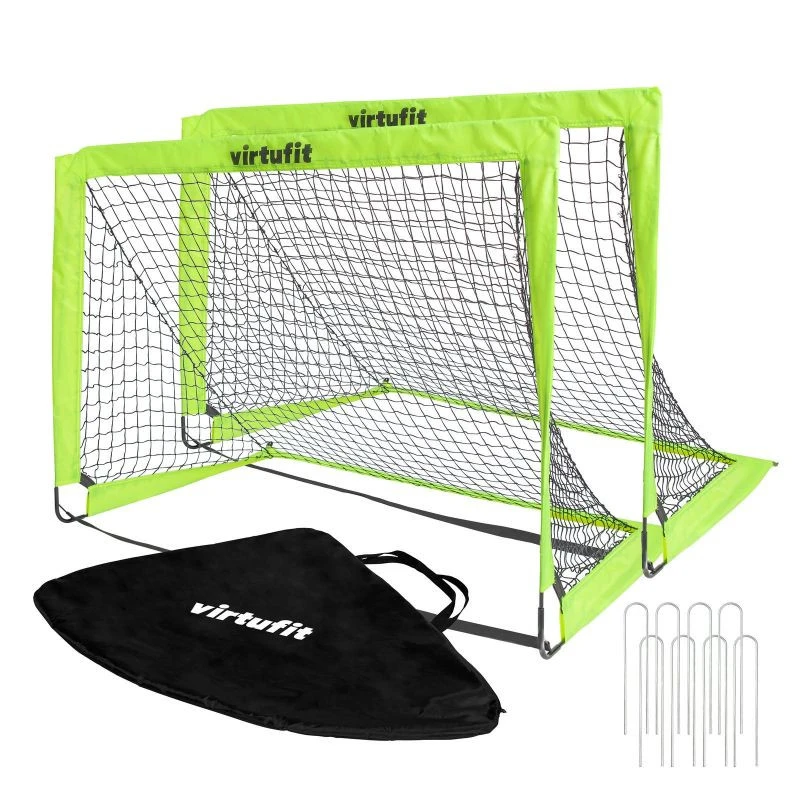 Niezależnie od tego, czy używasz ich do treningu, na podwórku czy na wakacjach, ten zestaw bramek piłkarskich VirtuFit Pop-Up Football Goals Set - Including Carry Bag można rozstawić w dowolnym miejscu w ciągu kilku sekund. Bramki mają wymiary 100x100x100 cm.