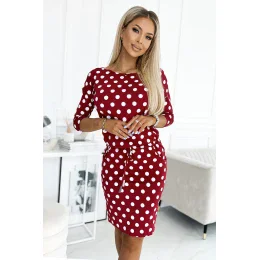 Sportovní šaty se zavazováním, kapsami, lodičkovým výstřihem a 3/4 délky rukávů - bordó s bílými puntíky. Vyrobeno z příjemné na dotek elastické látky. značka numoco. polská výroba.