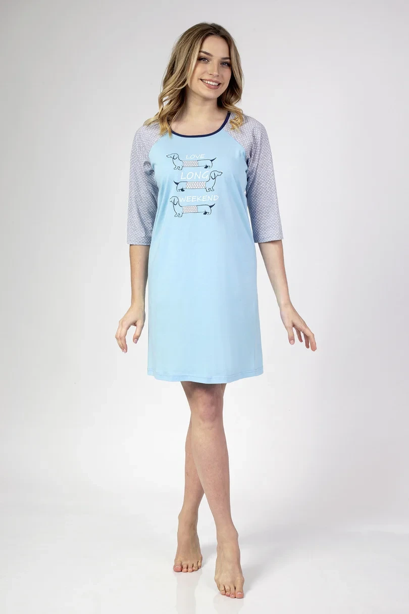 Dámské tričko s 3/4 rukávy z jemné bavlny, potisk na přední straně, kulatý výstřih, délka před kolena.