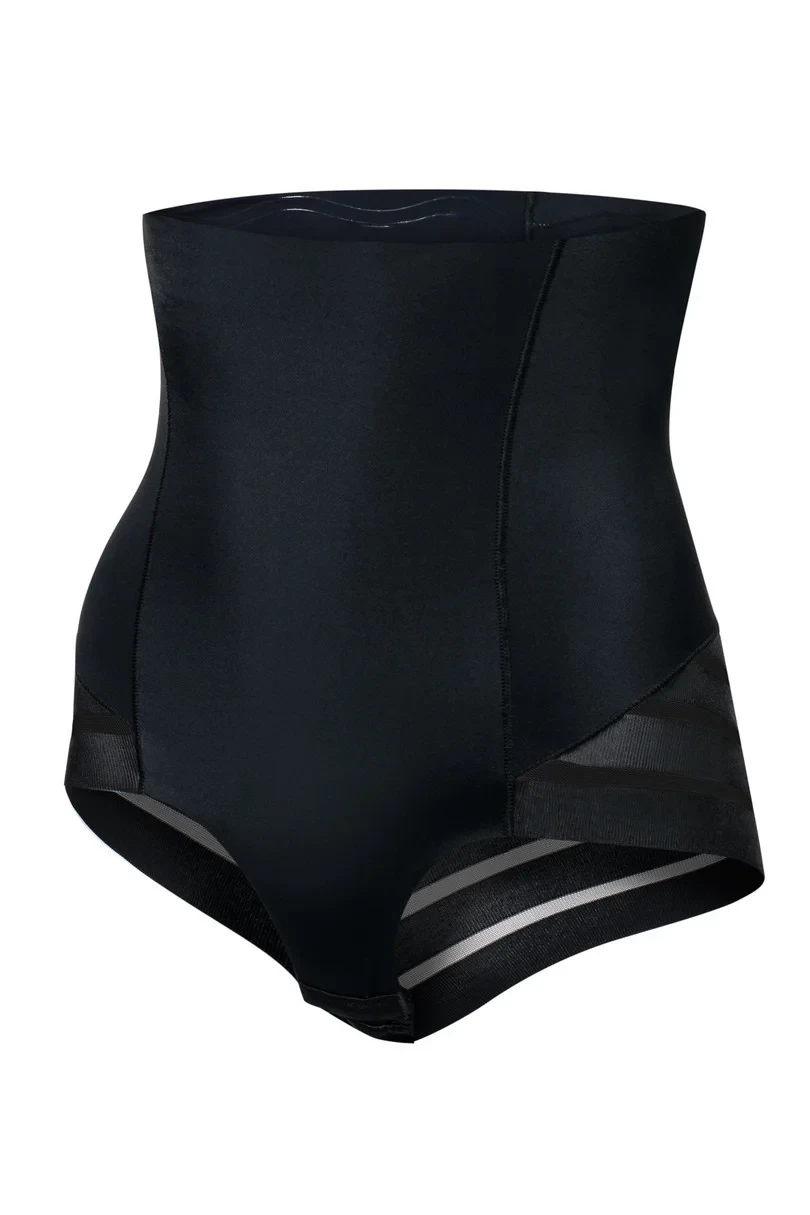 Kalhotky s vysokým pasem ozdobené průsvitnými všivkami a se zajímavě řešeným pozadím. Mají ploché a ultratenké okraje ušité pomocí technologie INVISIBLE_LINE a díky tomu nejsou vidět pod obepnutým oblečením. Kalhotky tvarují pas, břicho i zadeček. V rozkroku mají bavlněnou všivku. 88% polyamid, 12% elastan.