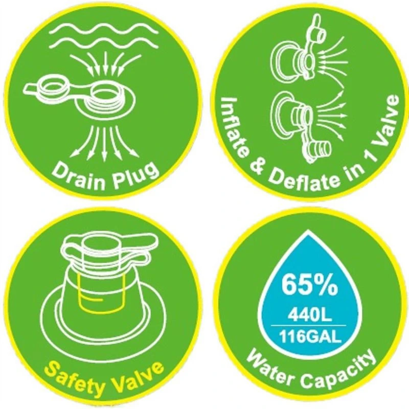 Bazén se velmi snadno nafoukne a vyfoukne, což vám umožní rychle ho připravit k použití nebo ho složit, když skončíte s hraním. Jeho jednoduchá konstrukce znamená, že jeho sestavení zabere jen několik minut a po vyfouknutí zabere jen velmi málo místa pro snadné skladování. Můžete ho snadno přemístit, vzít si ho na dovolenou nebo ho postavit kdekoli, kde chcete relaxovat a bavit se.