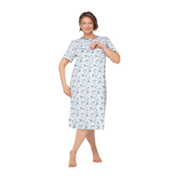 Dámská košile s krátkým rukávem z jemné vzorované bavlny s digitálním potiskem. Otevřený výstřih, řasení na prsou, délka košile ke kolenům.