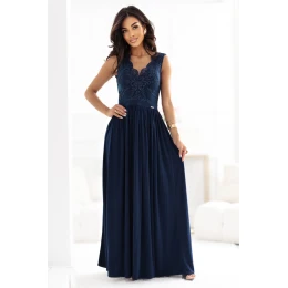 215-6 LEA dlouhé elegantní maxi šaty s krajkovým vrškem a rozparkem na nohou - tmavě modré