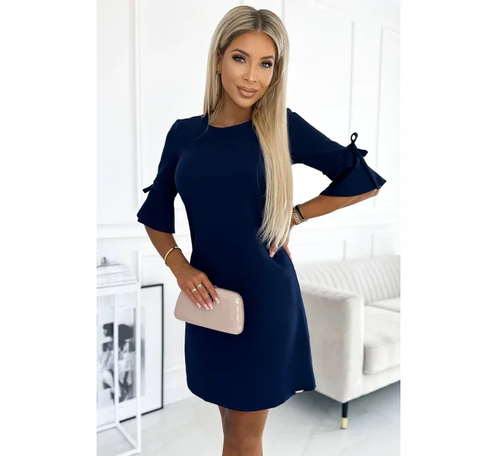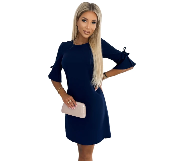 Neva - trapézové pohodlné šaty s rozšířenými rukávy a mašlemi - velmi ženské. z hladkého materiálu. barva - tmavě modrá. značka numoco.