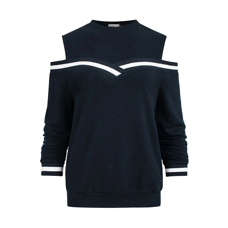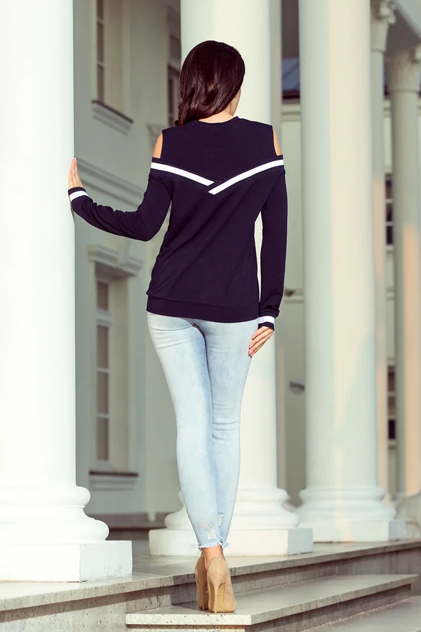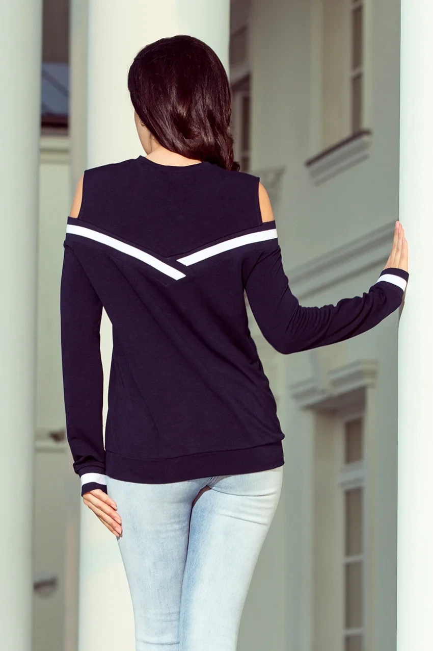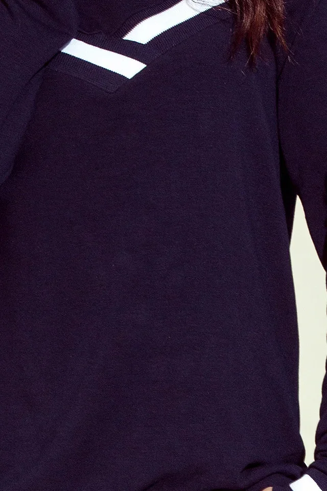 Pohodlná tmavě modrá mikina s otevřenými rameny - zakončená velmi módním žebrováním v bílé a tmavě modré barvě. polský výrobek. značka numoco.