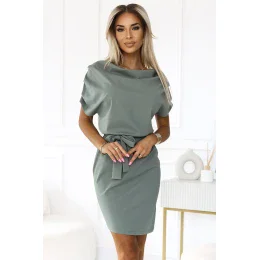 Roxi - stylové šaty značky Numoco s výjimečným střihem, který spojuje eleganci s pohodlím. Model má asymetrickou sukni, zvýrazněnou páskem, a "vodní" výstřih, který dodává kreaci jemný půvab. Jsou vyrobeny z elastického úpletu v módní olivově zelené barvě a dokonale se přizpůsobí postavě. Polský výrobek, ideální pro různé příležitosti, spojující moderní design s vysokou kvalitou zpracování.