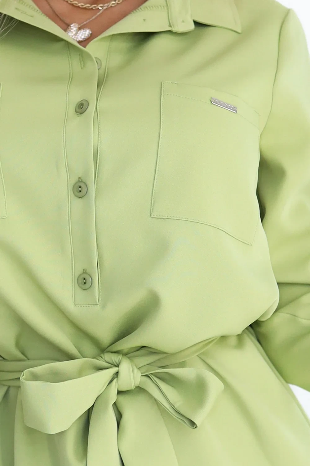 Stylové olivově zelené košilové šaty se zavazováním v pase od značky Numoco. Díky klasickému střihu, dlouhým rukávům a elegantnímu límečku se skvěle hodí do práce i na každodenní nošení. polský výrobek.