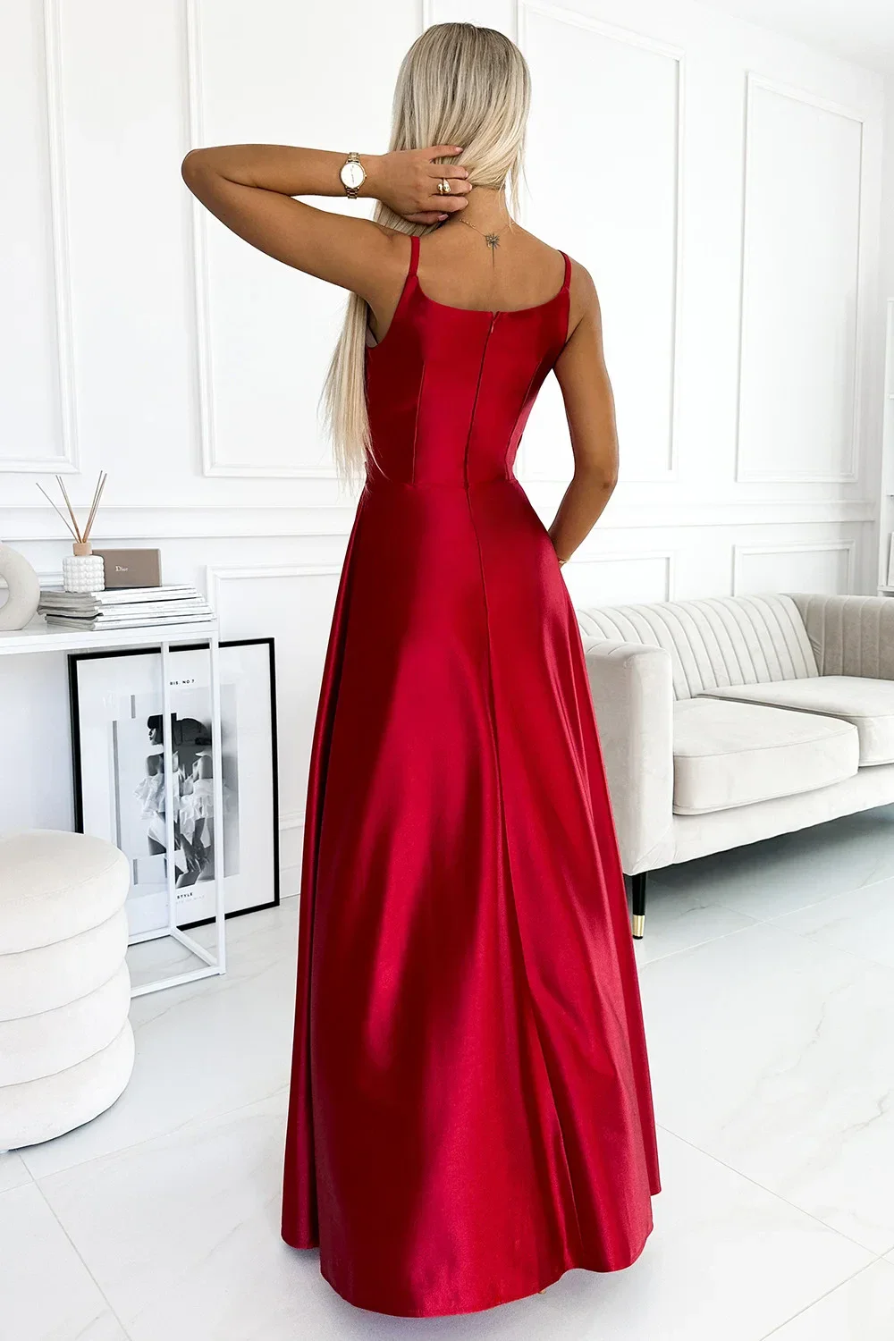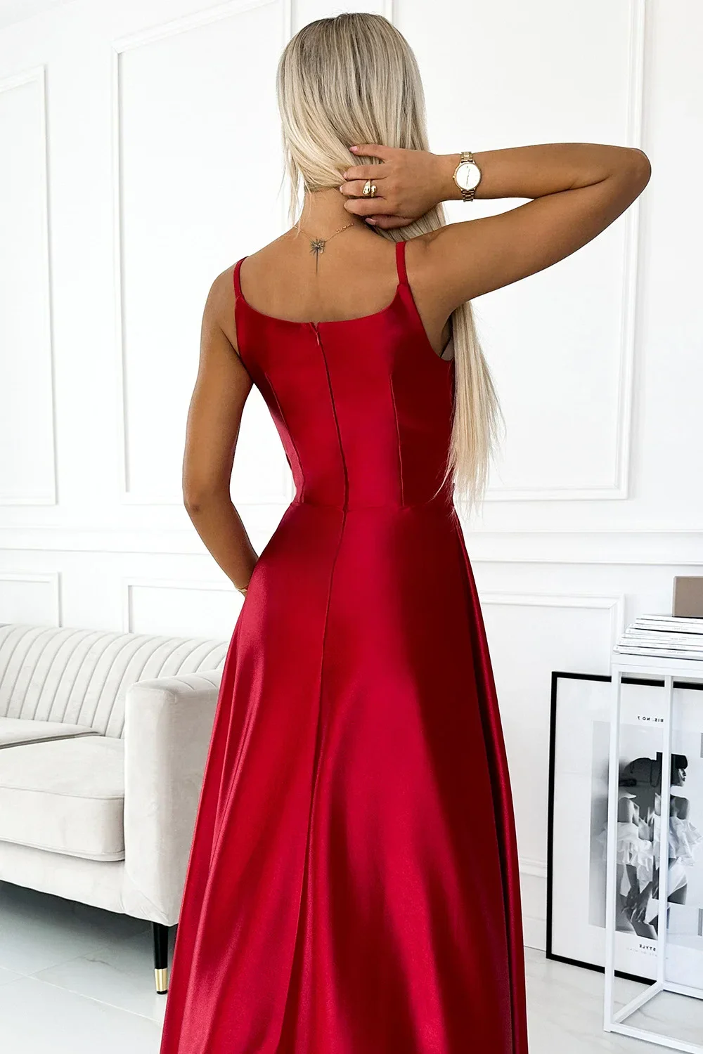 Chiara - elegantní maxi dlouhé saténové šaty na ramínka. Krásně tvarovaný výstřih a rozparek na sukni vytváří neobvyklou kompozici. Vyrobeno z lesklého, hladkého, lehce elastického saténu v červené barvě. Šaty se skvěle hodí na svatbu, Silvestra, ples, karneval a další významné události. Vyrobeno v Polsku firmou Numoco.