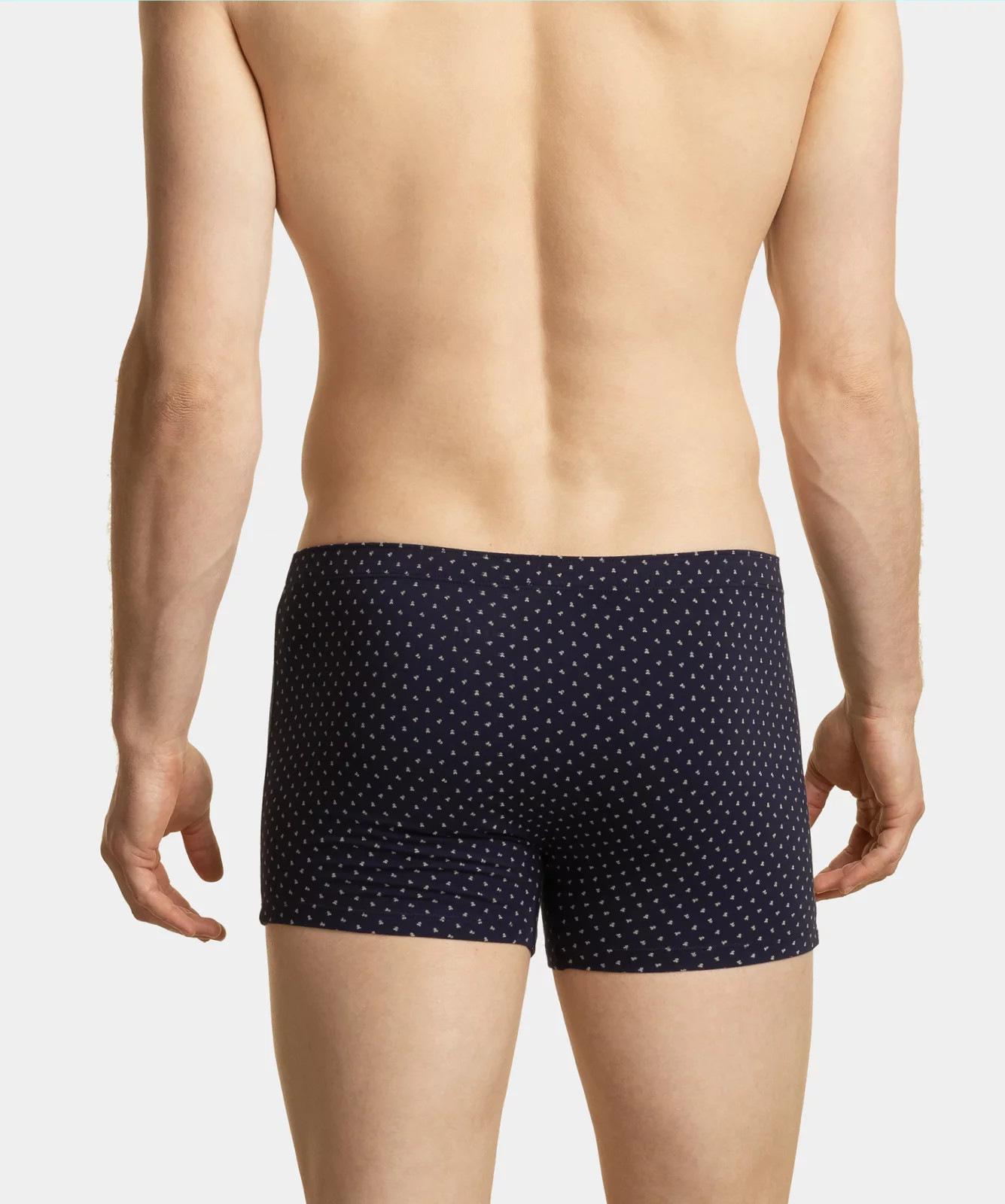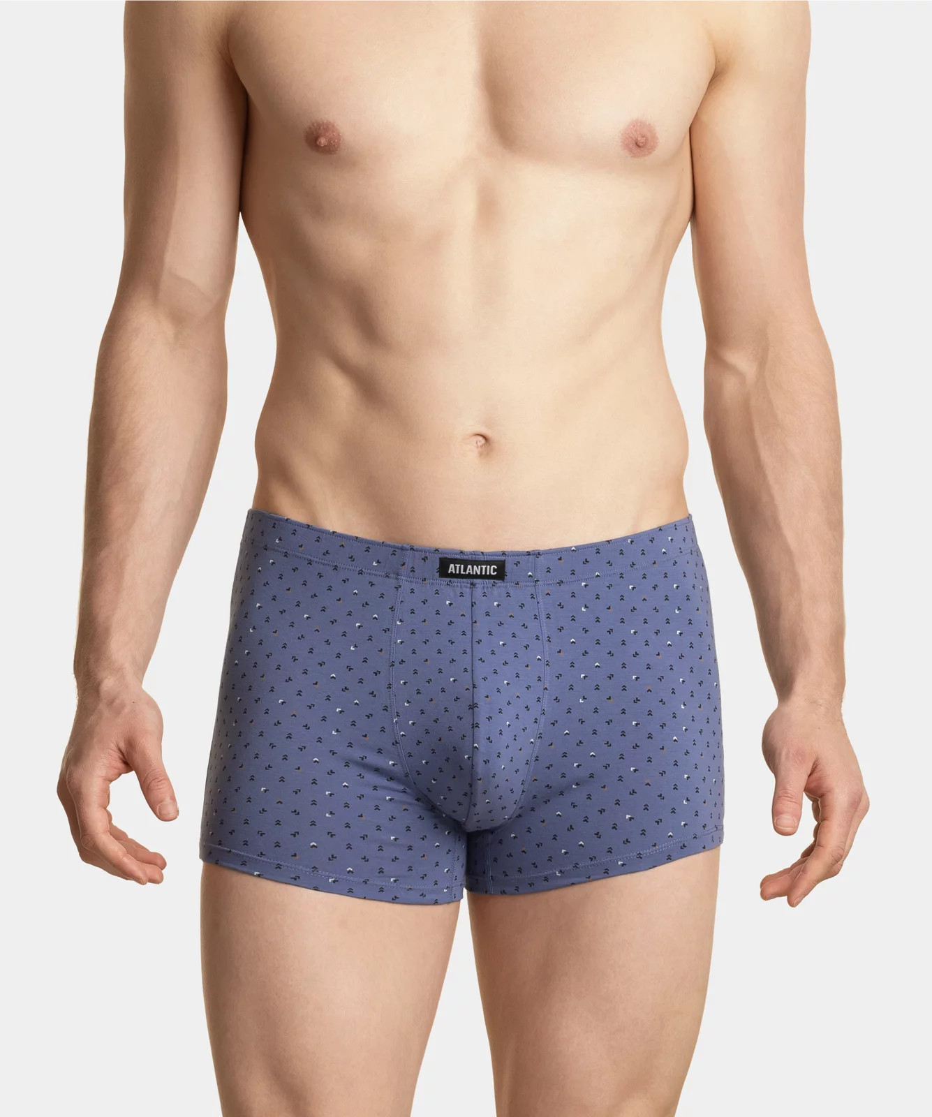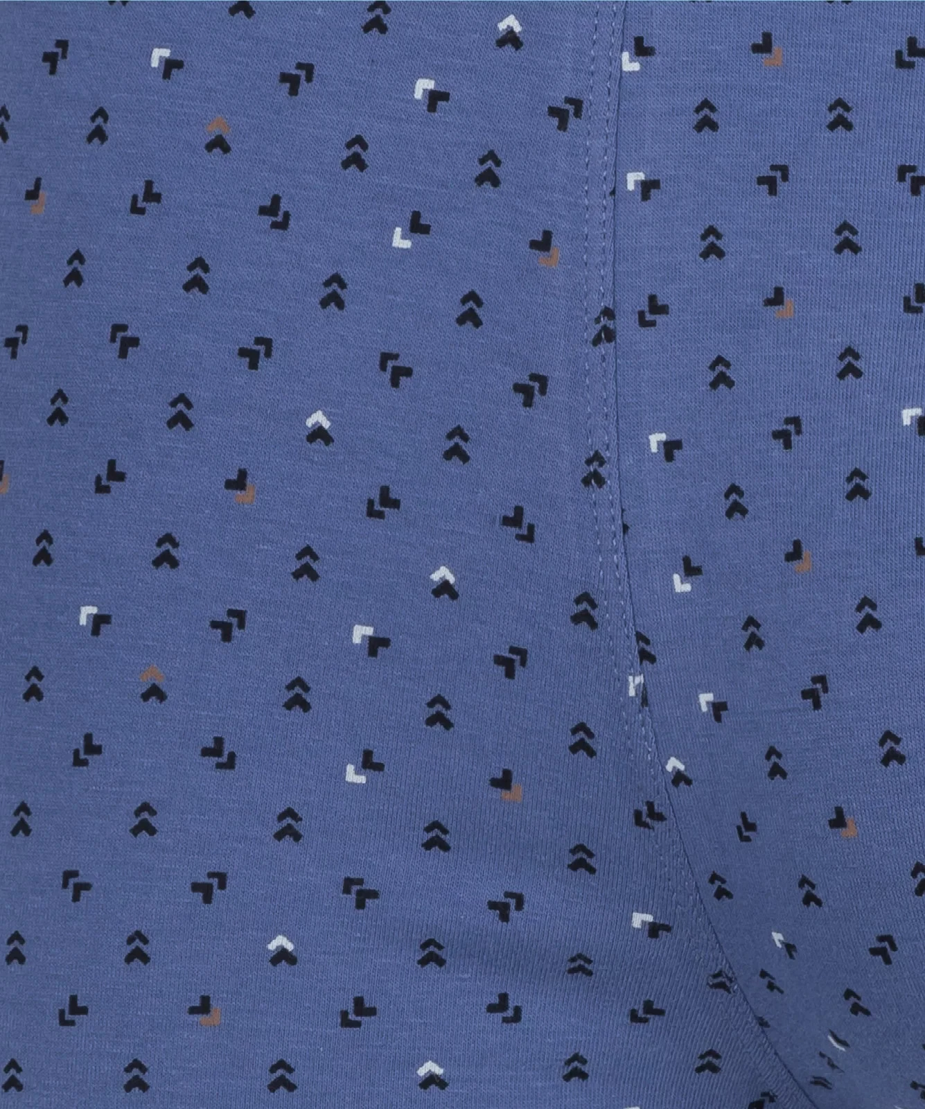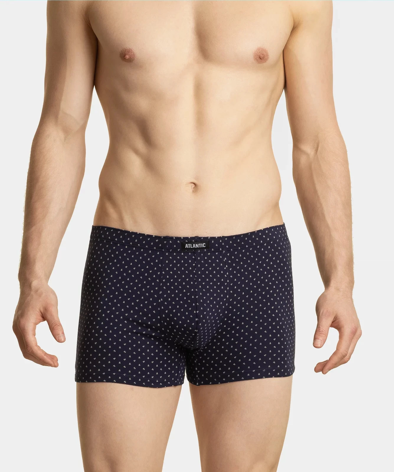 W 3-packu znajdują się bokserki męskie: niebieskie i czarne - ozdobione niewielkimi wzorkami o graficznym charakterze oraz ciemno-niebieskie - gładkie. Klasyczna w charakterze bielizna ma średniej wysokości stan oraz uniwersalnej długości nogawki. W talii majtki wykończone są miękką i nieuciskającą ciała gumą wewnętrzną. W bieliźnie zastosowano także profilujące szwy, które sprawiają, że bokserki idealnie dopasowują się do ciała. Bokserki wykonane są z delikatnej, a przy tym wytrzymałej w użytkowaniu bawełny połączonej z rozciągliwym elastanem. Przepuszczająca powietrze dzianina zapobiega nadmiernemu poceniu się ciała