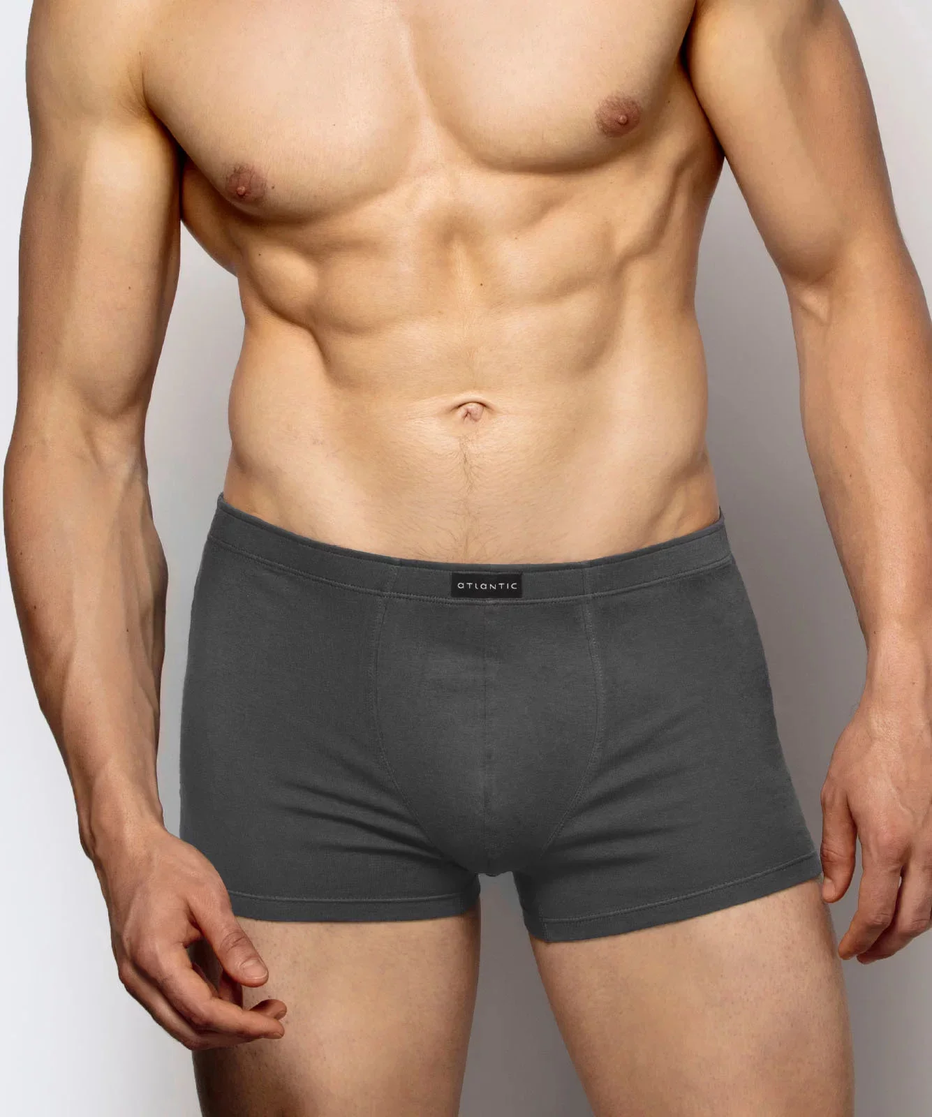 Przylegające do ciała bokserki w kolorze grafitowym, wykończone są w talii niezwykle komfortową i nieuciskającą gumą tunelową. Wykonane są z miękkiej w dotyku i miłej dla skóry bawełny połączonej z elastanem, która dodatkowo jest wytrzymała, oddychająca, odporna na wysokie temperatury oraz mechaniczne działanie, a poprzez zdolność wchłaniania wody, zapobiega poceniu się.