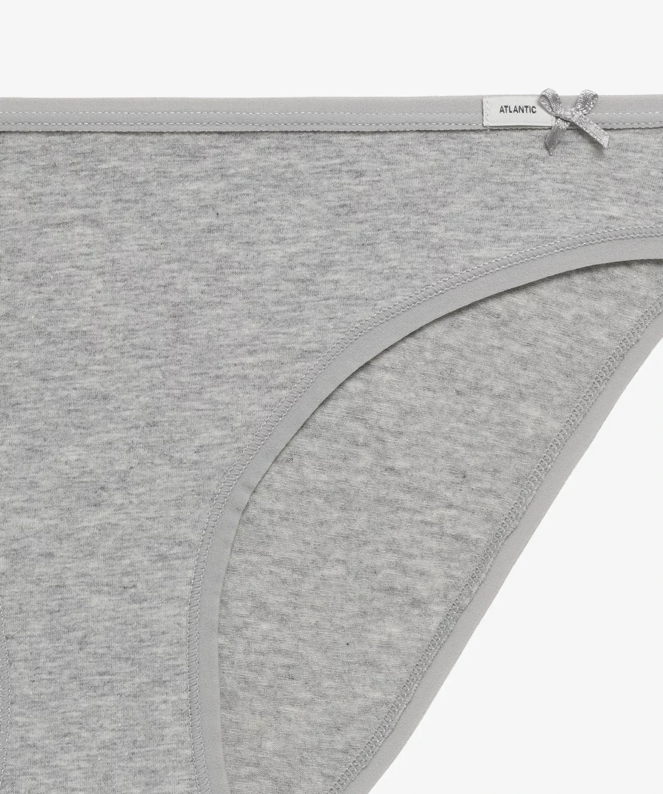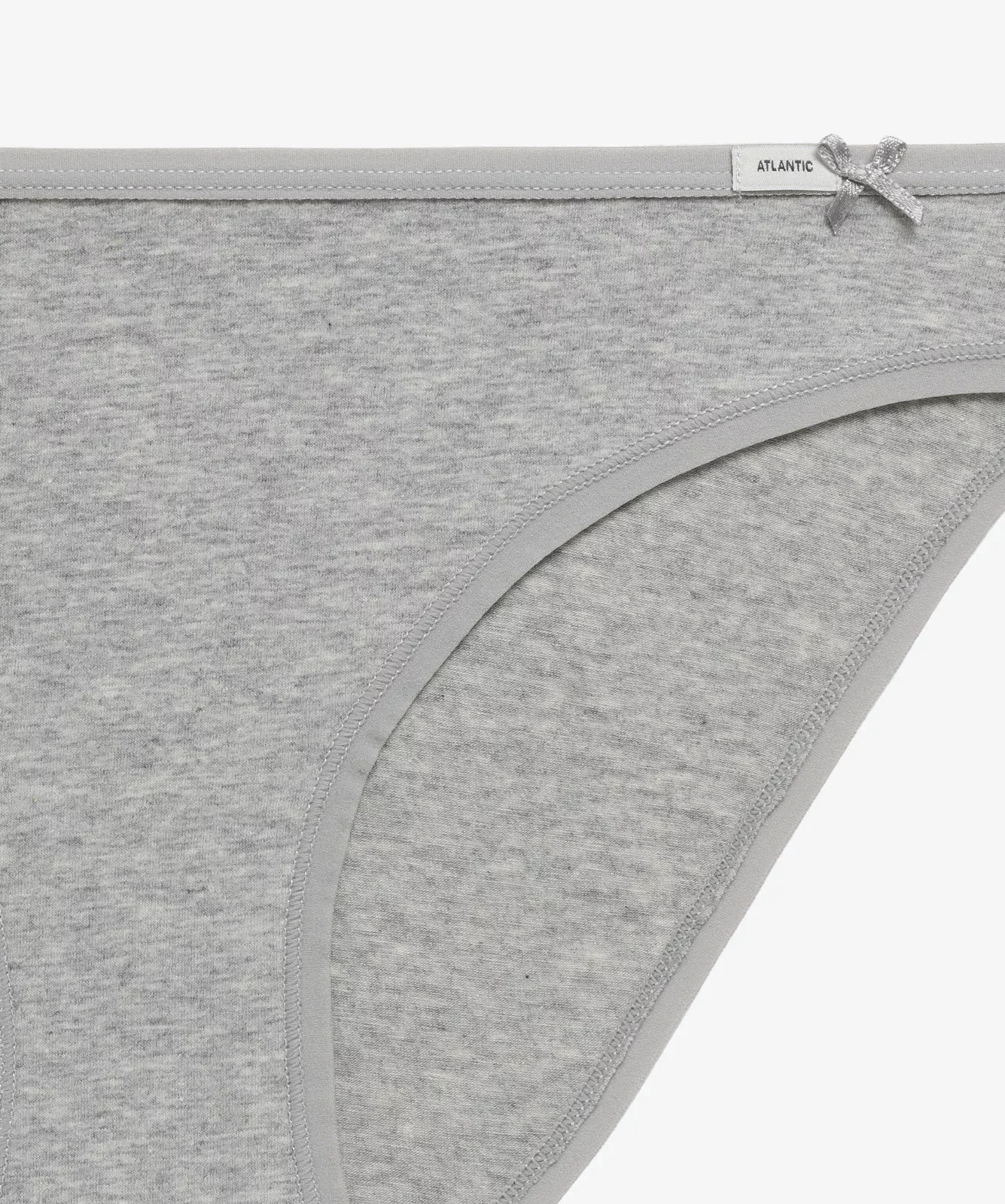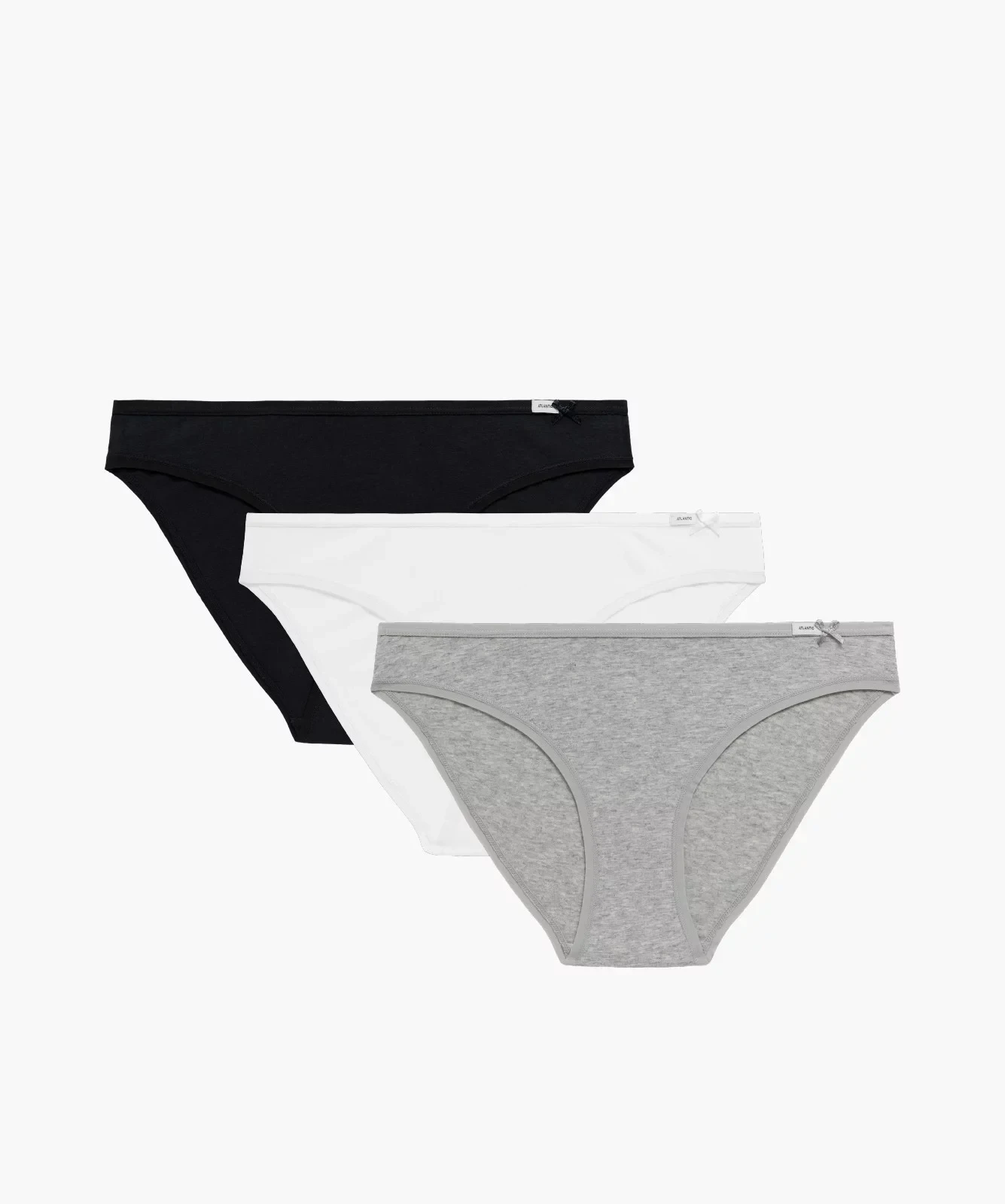 Nasz trzypak to figi damskie o kroju bikini w uniwersalnych kolorach: białym, czarnym i jasnym odcieniu szarego melanżu. Majtki odznaczają się niskim stanem wykończonym miękką i nieuciskającą ciała lamówką z małym logo Atlantic oraz dość głęboko wyciętymi bokami, eksponującymi i wydłużającymi nogi.