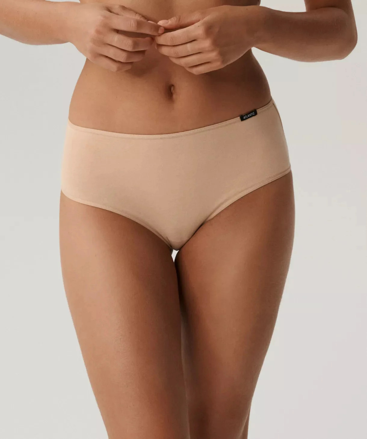 Te figi damskie mają najbardziej uniwersalny charakter, jaki możesz sobie wyobrazić. To idealna bielizna na każdy dzień. W trzypaku znajdują się beżowe majtki o klasycznym kroju - są szerokie po bokach i mają wysoki stan. W talii wykończone są nieuciskającą ciała gumą z logo Atlantic po lewej stronie.