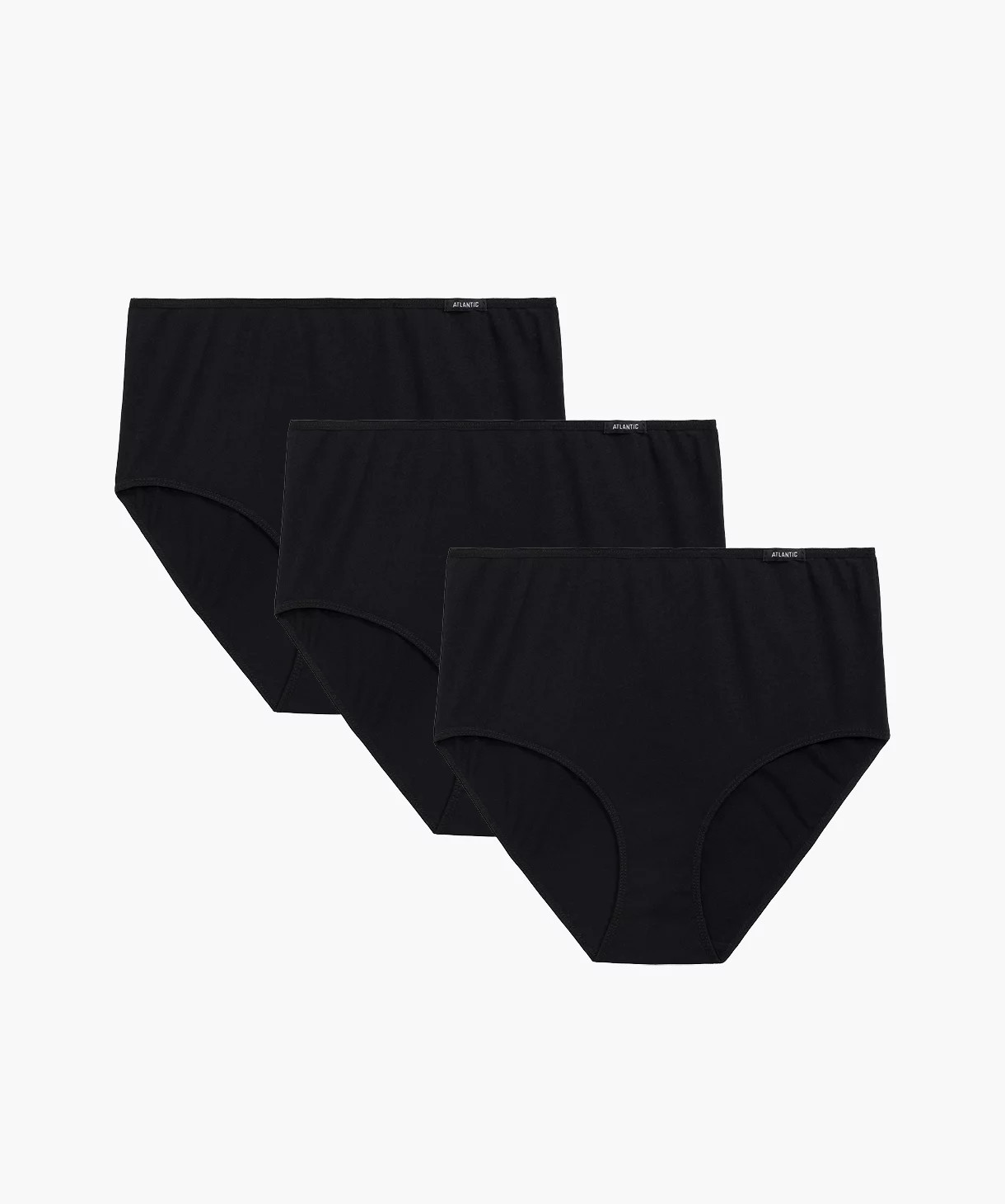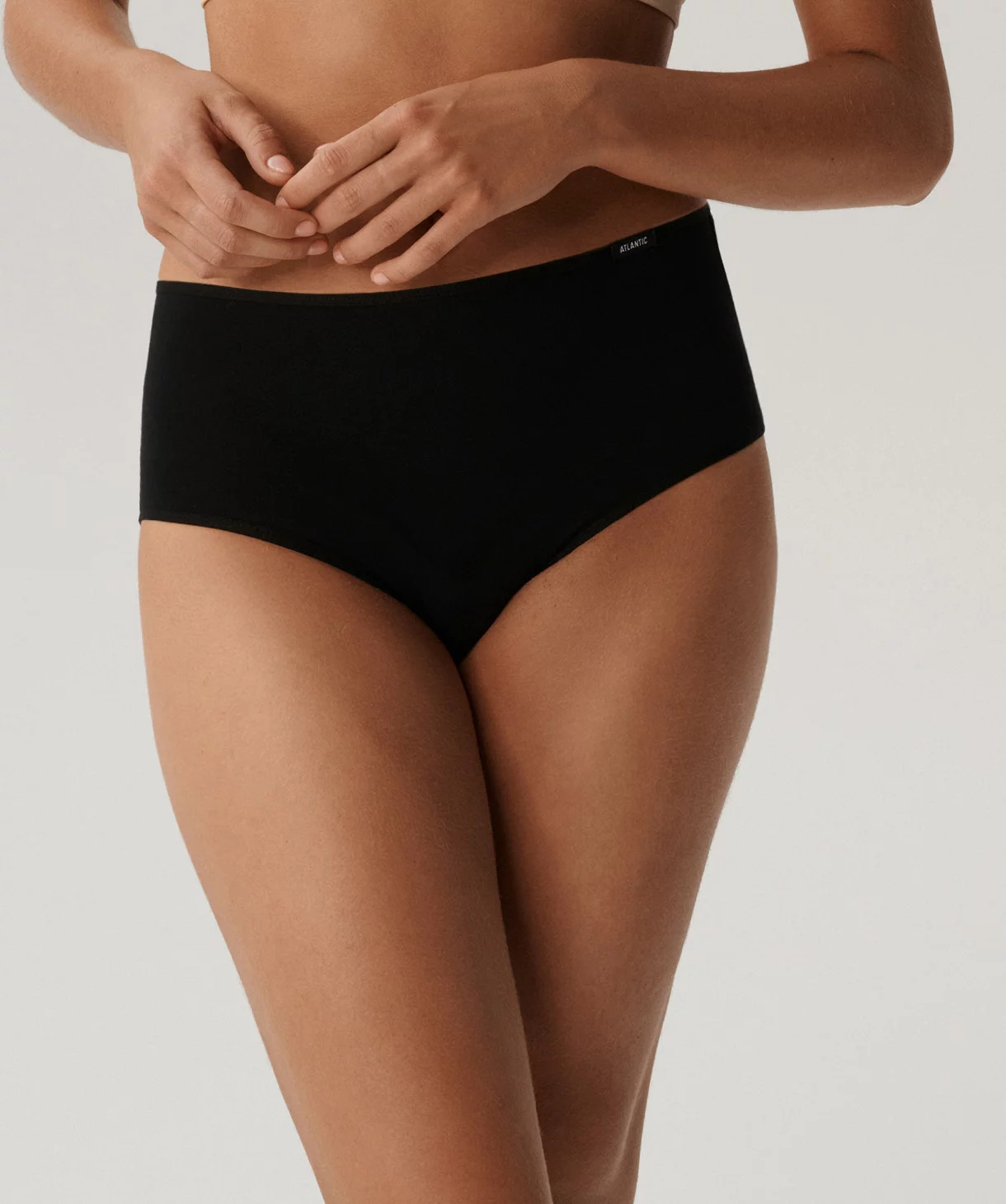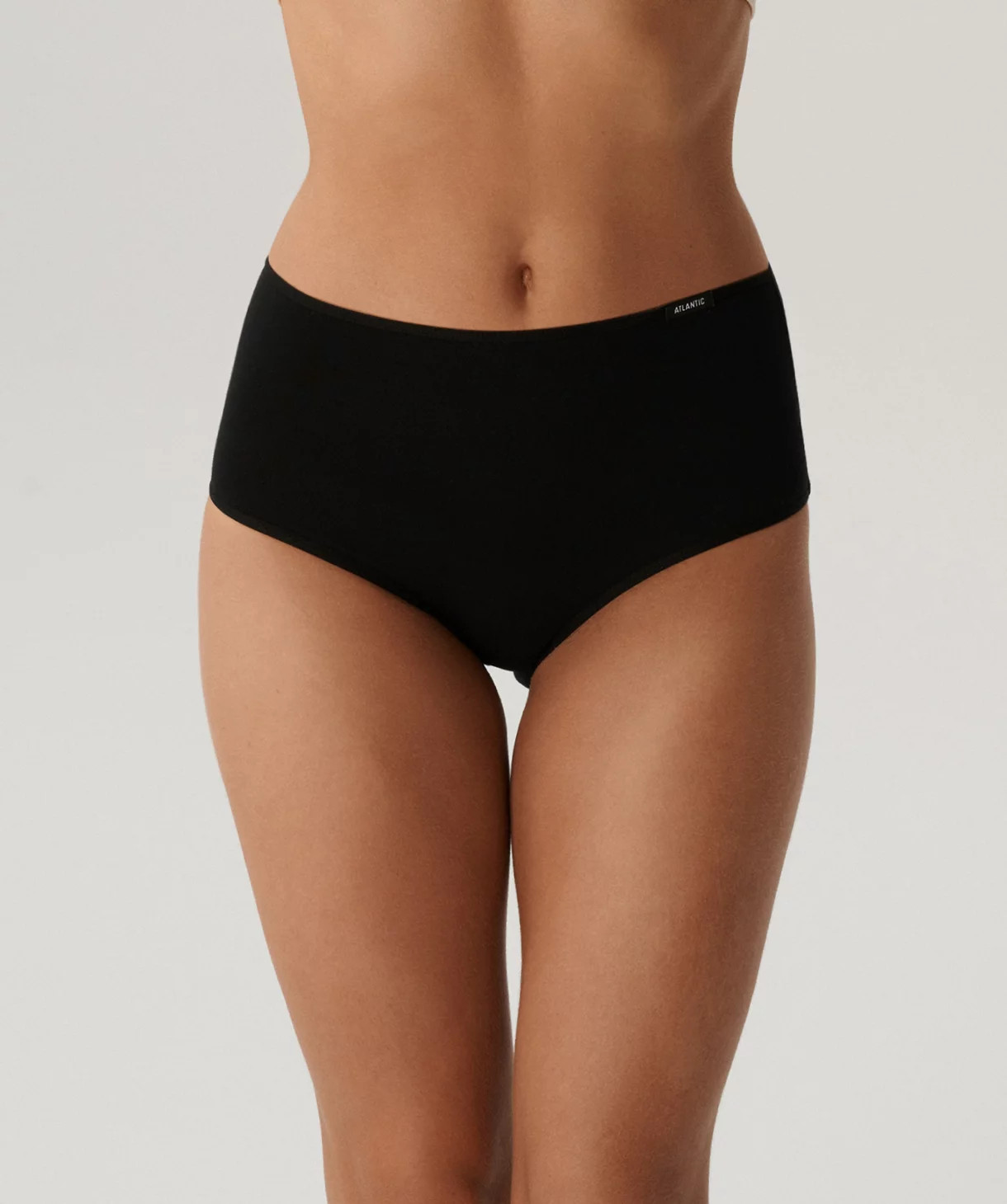 To figi damskie o najbardziej uniwersalnym charakterze, jaki możesz sobie wyobrazić. Majtki w kolorze czarnym są bardzo szerokie po bokach i wysoko zachodzą na brzuch, a w talii wykończone są miękką i nieuciskającą ciała gumą ozdobioną z lewej strony logo Atlantic.