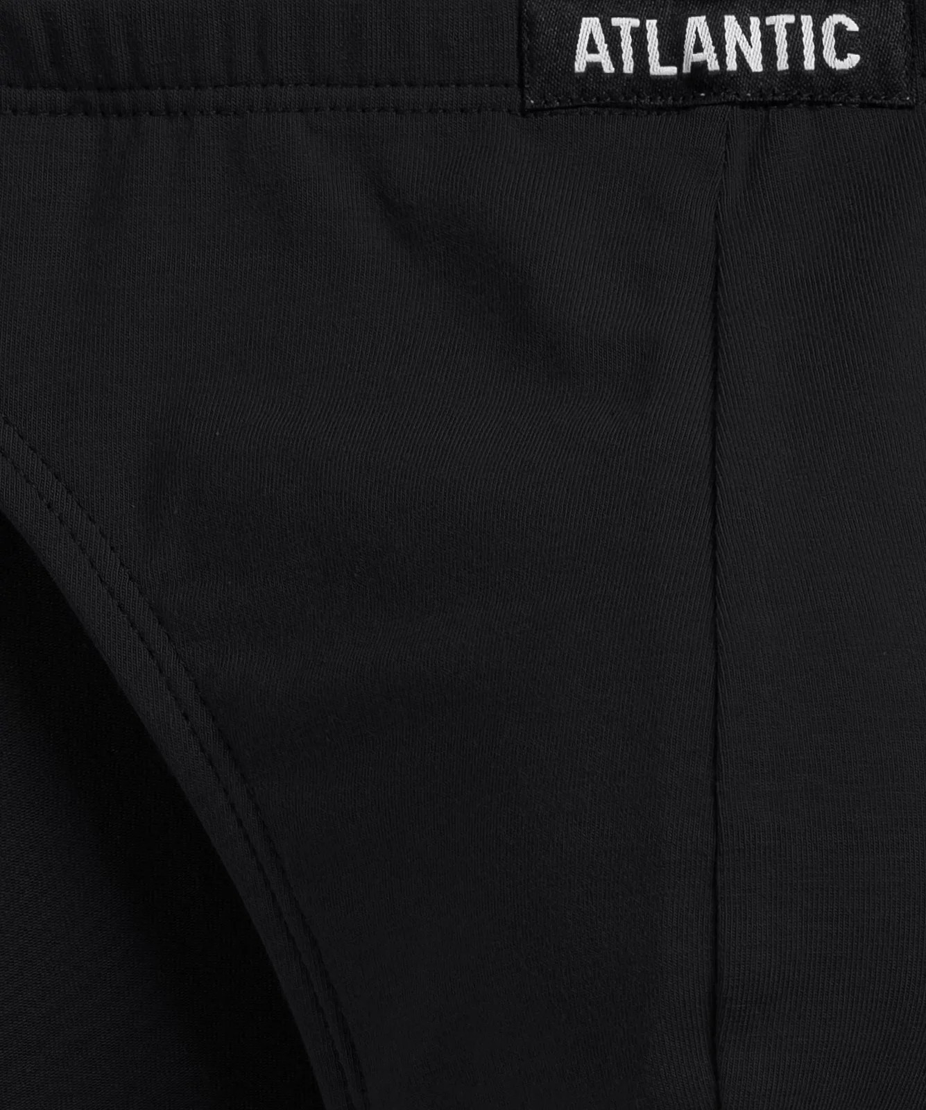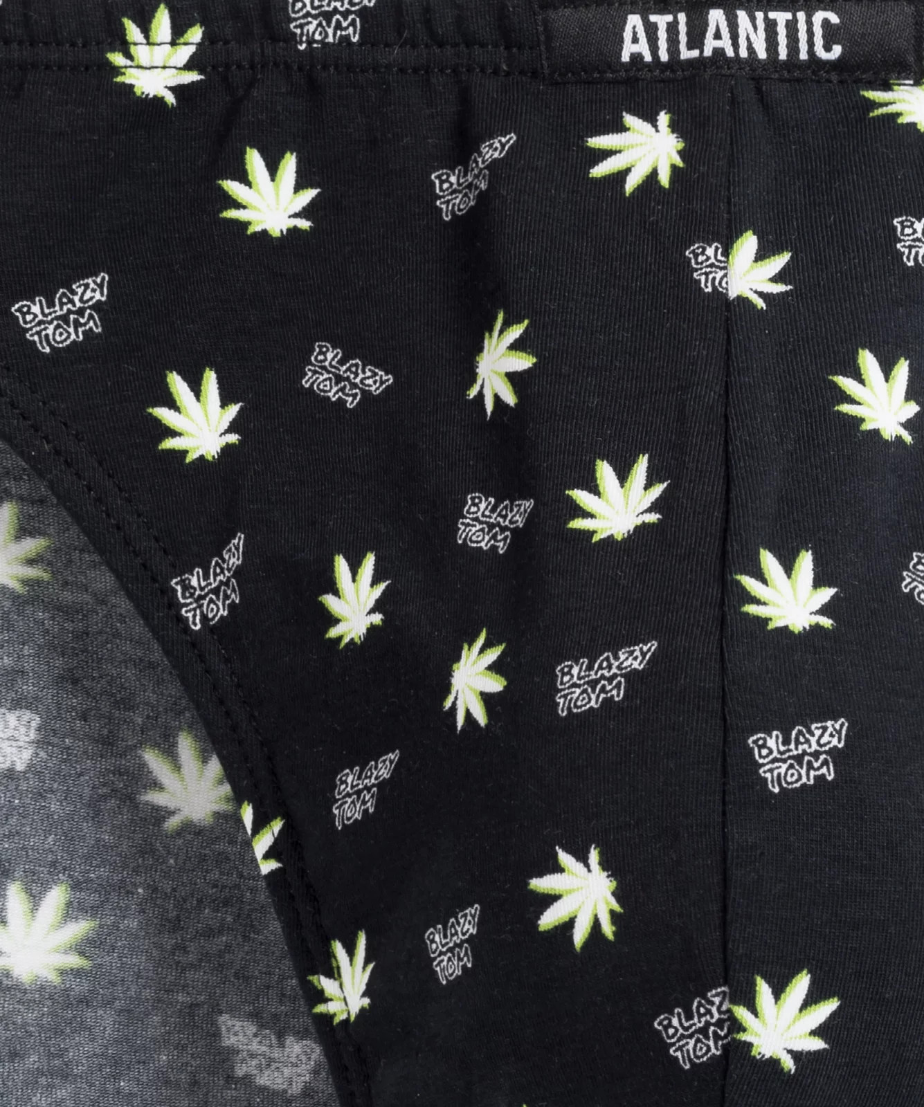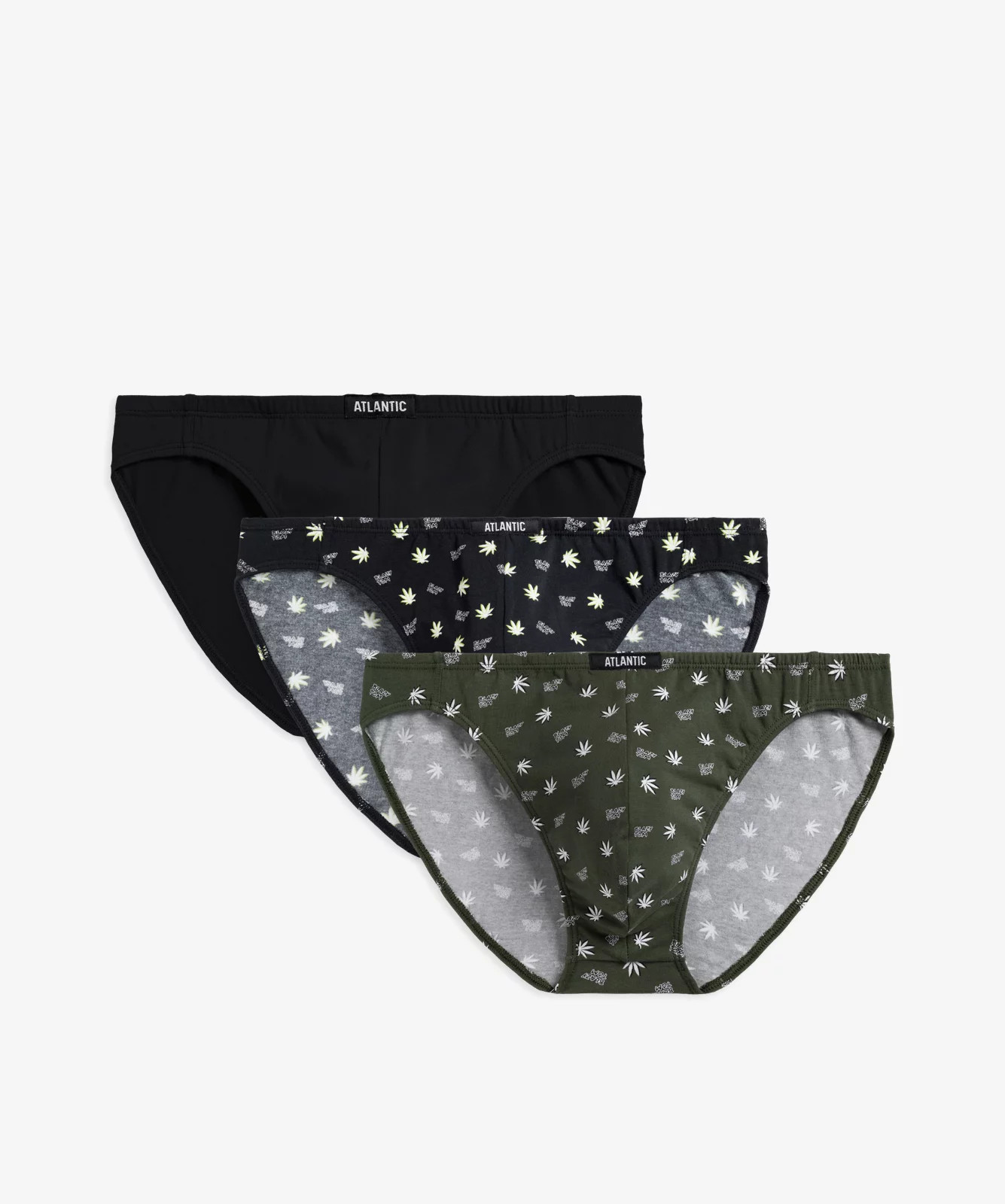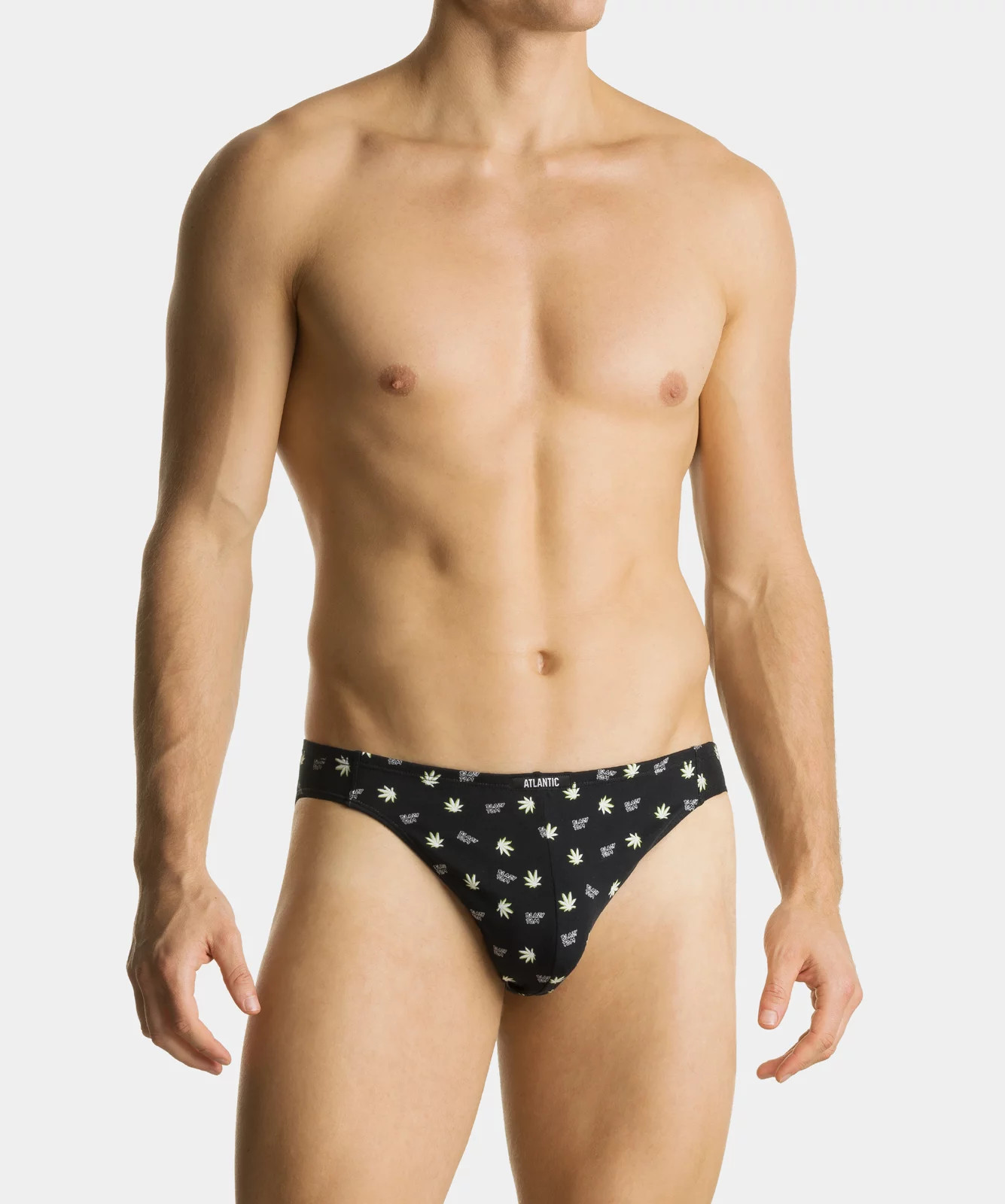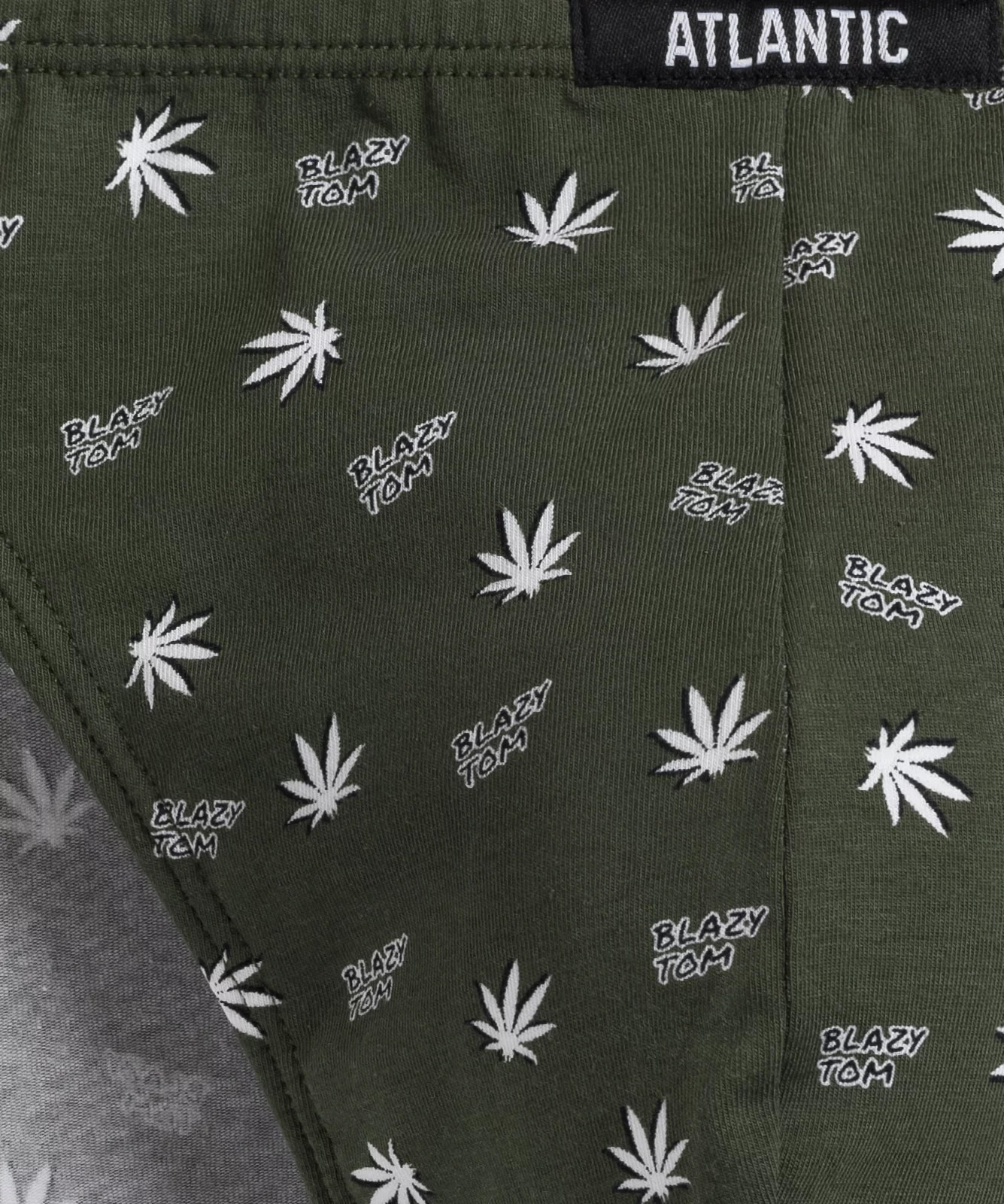 3-pack slipów męskich w kolorach: czarne (gładkie) oraz khaki i czarne (z zabawnym nadrukiem w liście konopi). Slipy są bardzo wysoko podkrojone wokół ud i mają niską talię wykończoną miękką, ledwo wyczuwalną i nieuciskającą gumą wewnętrzną. Z przodu naszyta mała, czarno-biała metka z logo ATLANTIC. Do wykonania bielizny sięgnęliśmy po przyjemny w dotyku „cotton stretch”, który jest kombinacją delikatnej bawełny oraz rozciągliwego elastanu. Nasza dzianina jest ponadto trwała w użytkowaniu, przepuszczająca powietrze, zapobiegająca poceniu się ciała i wreszcie przyjazna dla nawet najbardziej wrażliwej skóry.