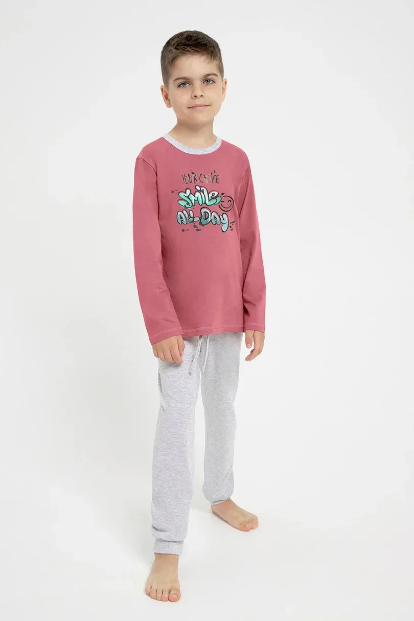 Chlapecké pyžamo z vysoce kvalitní bavlny. Tričko s dlouhými rukávy zdobené potiskem. Doplňují je dlouhé pevné kalhoty se šňůrkami na nohavicích. Nastavitelná šňůrka v pase.