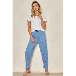Dámské pyžamo s krátkým rukávem ušité z jemné pevné bavlny, jemný potisk na úrovni hrudníku. Kulatý výstřih. Doplňují je dlouhé kalhoty s módním potiskem.