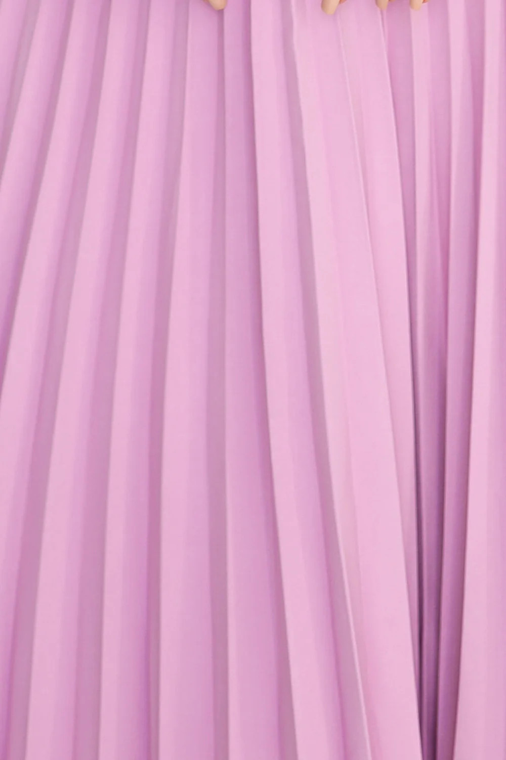 Lila - elegantní plisované midi šaty v barvě vřesu jsou ideální volbou pro ženy, které ocení styl a pohodlí. Jsou vyrobeny z lehkého, plisovaného materiálu, krásně naaranžovaného na siluetě a zdůrazňujícího její přednosti. Pásek, který lze uvázat na mašli, dodává romantický akcent a zvýrazňuje pas. Krátký rukáv poskytuje volnost pohybu a krytý zip na zádech zajišťuje dokonalé přizpůsobení. Ideální na elegantní vycházky, letní večírky a rodinné oslavy. Polský výrobek: značka Numoco.