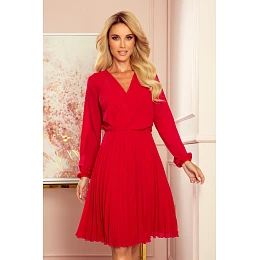 313-5 ISABELLE Plisované šaty s výstřihem a dlouhými rukávy - ČERVENÉ
