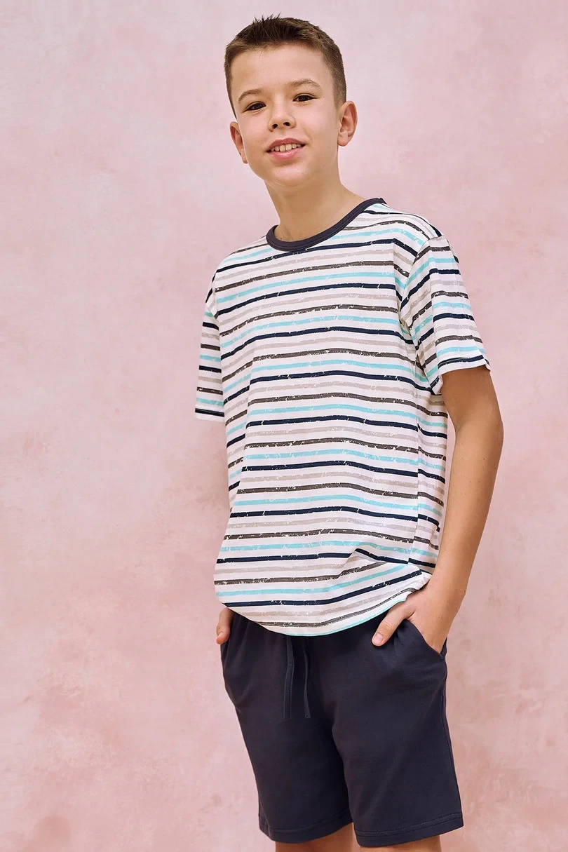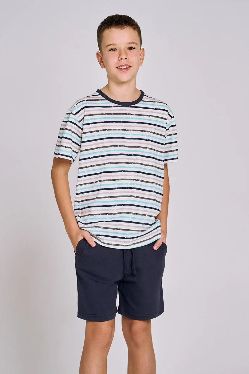 Klasické chlapecké pyžamo s krátkým rukávem, vyrobené z bavlny, pruhované tričko, kulatý výstřih. Doplněné pevnými krátkými šortkami s kapsami a nastavitelnou šňůrkou.