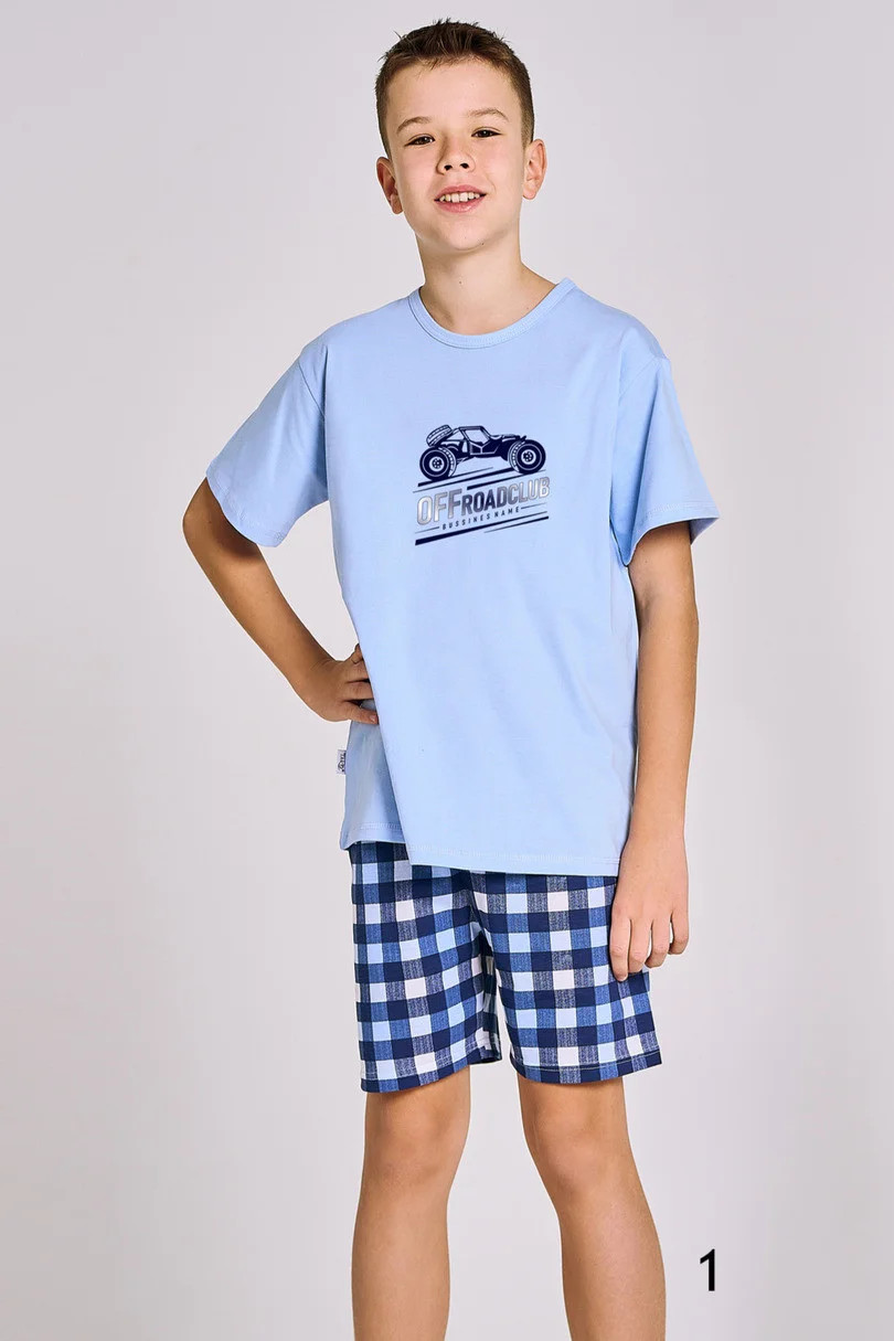 Chlapecké bavlněné pyžamo, tričko s krátkým rukávem zdobené potiskem. Doplněné krátkými kostkovanými šortkami.