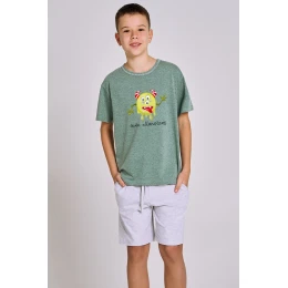 Klasické chlapecké pyžamo s krátkým rukávem, vyrobené z bavlny, tričko s barevným potiskem na přední straně, kulatý výstřih. Doplněné pevnými krátkými šortkami s kapsami a nastavitelnou šňůrkou.