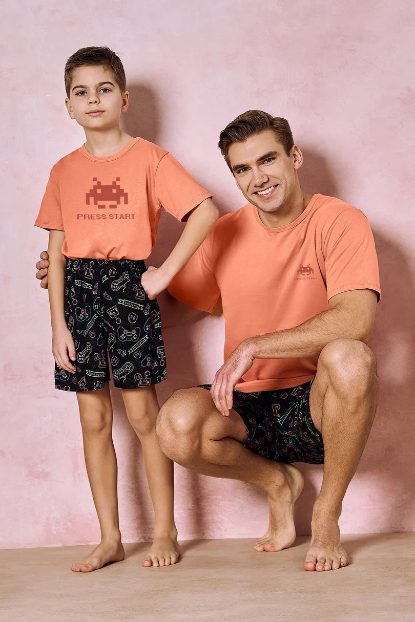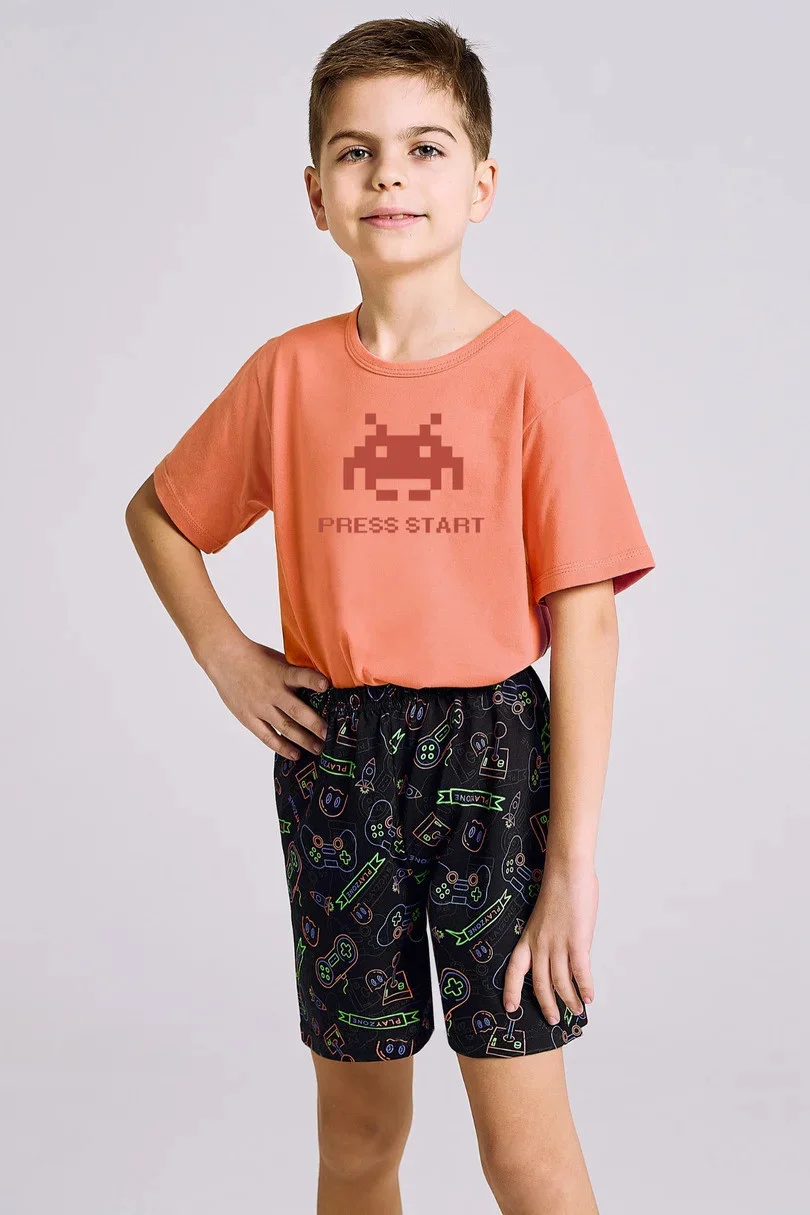 Chlapecké pyžamo ušité z kvalitní bavlny. Tričko s krátkým rukávem, vpředu zdobené barevným potiskem.Doplněné krátkými vzorovanými šortkami.