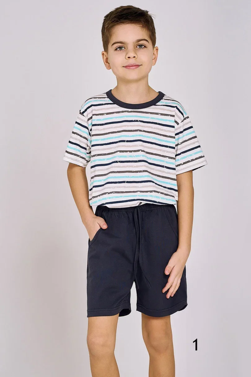 Klasické chlapecké pyžamo s krátkým rukávem, vyrobené z bavlny, pruhované tričko, kulatý výstřih. Doplněno pevnými krátkými šortkami s kapsami a šňůrkou na stažení pro nastavení.