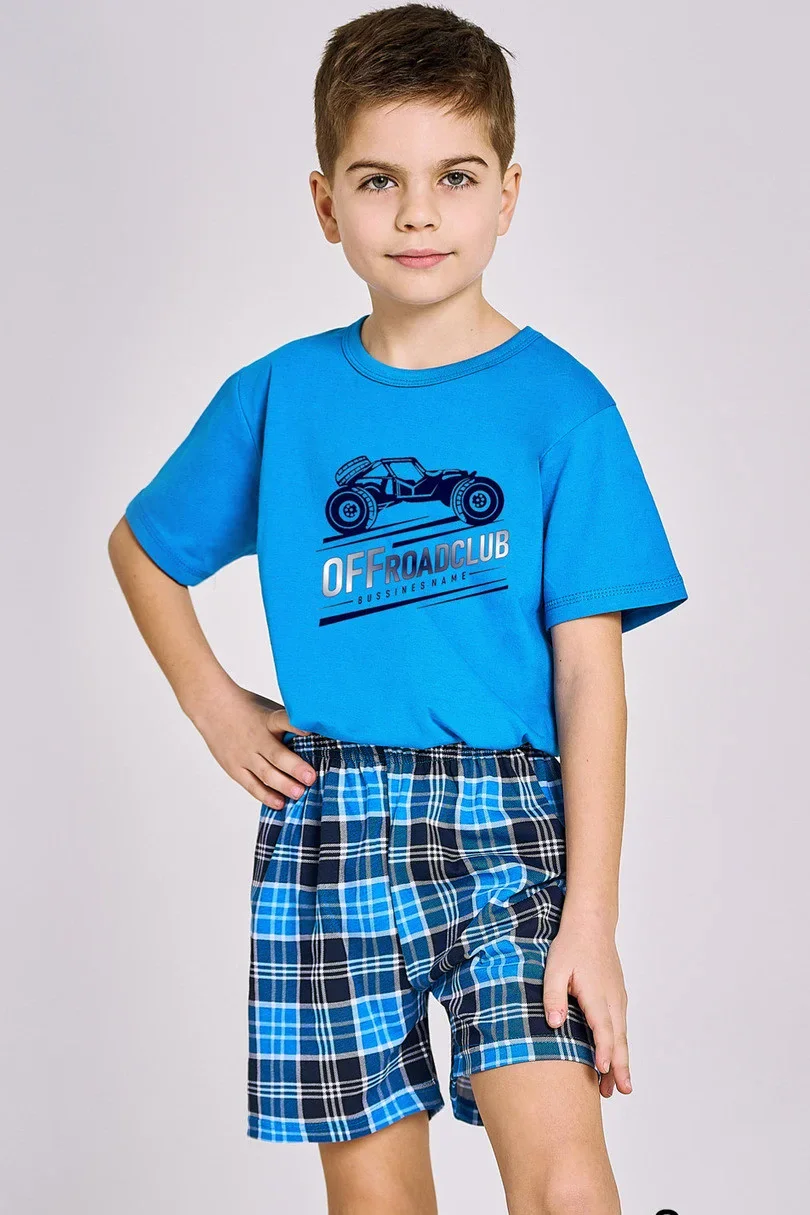 Chlapecké bavlněné pyžamo, tričko s krátkým rukávem zdobené potiskem. Doplněné krátkými kostkovanými šortkami.