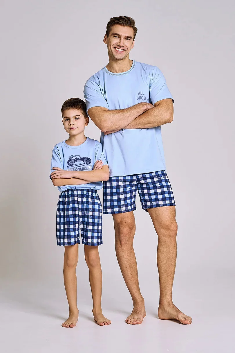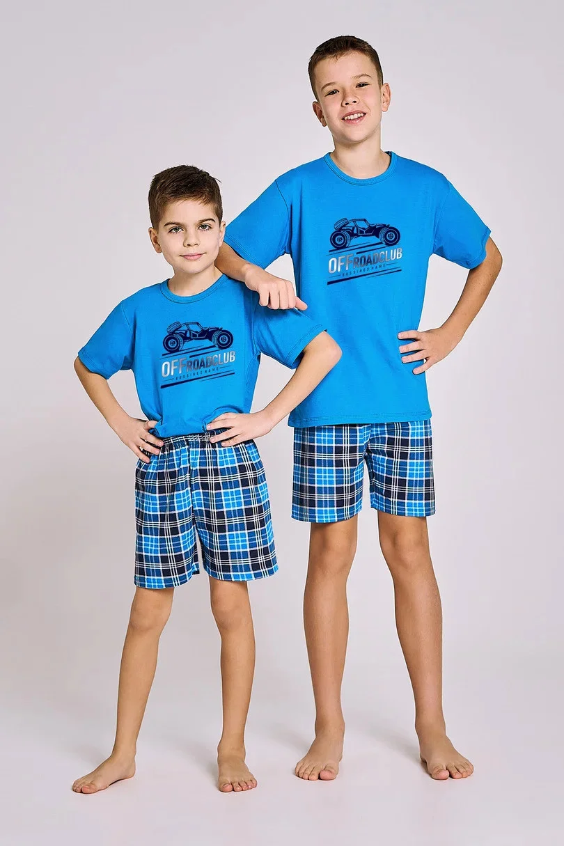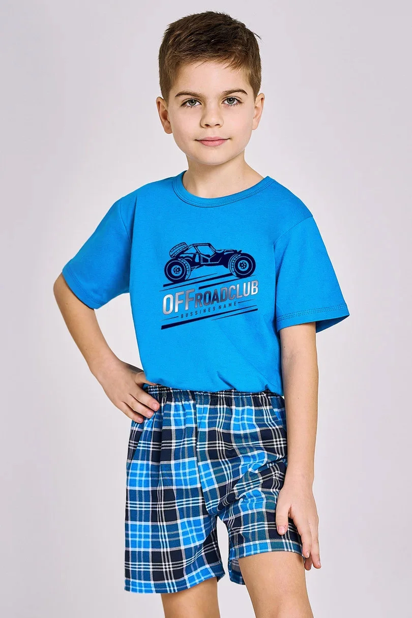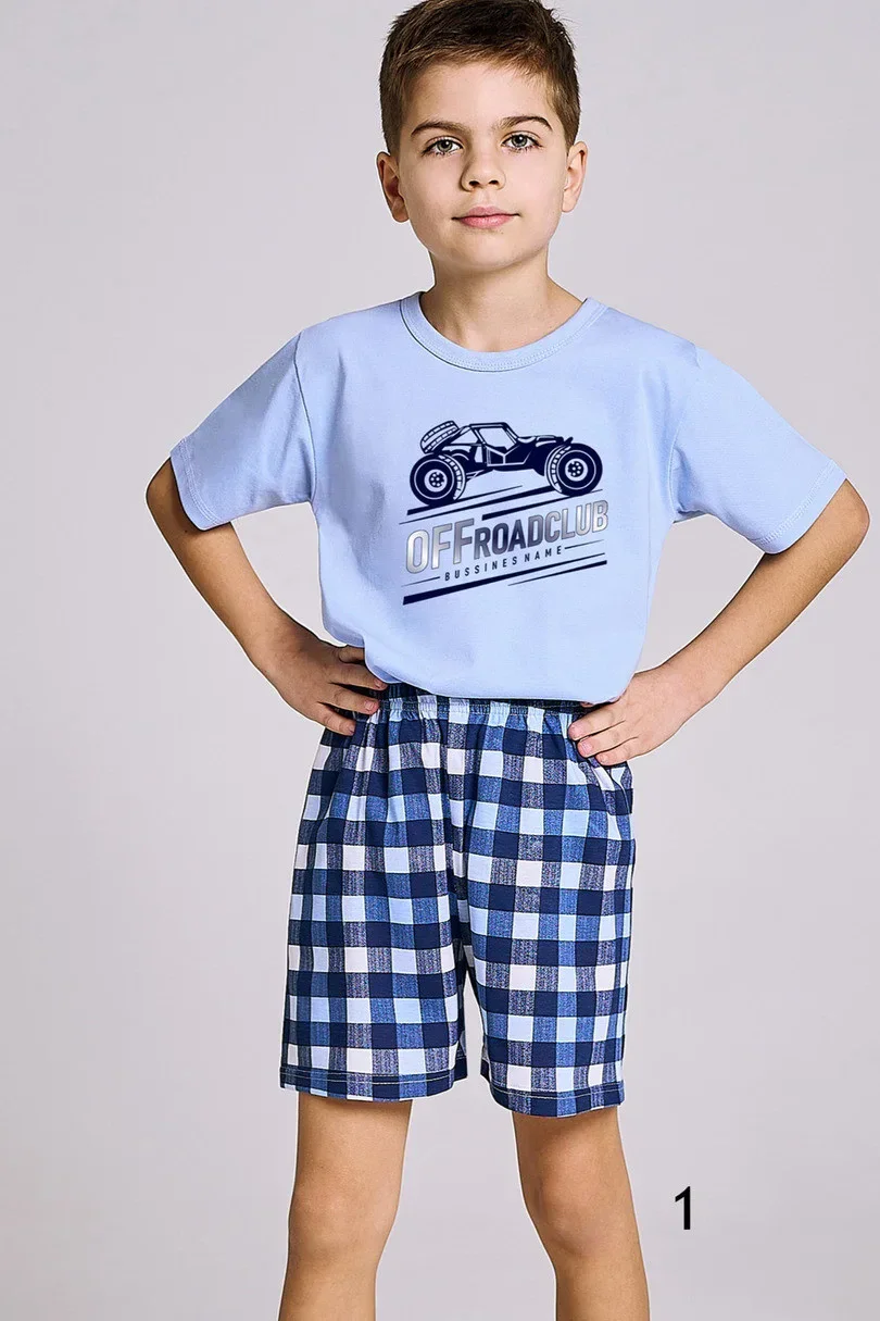 Chlapecké bavlněné pyžamo, tričko s krátkým rukávem zdobené potiskem. Doplněné krátkými kostkovanými šortkami.