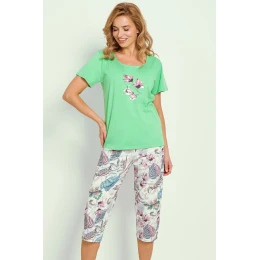 Dámské pyžamo z jemné bavlny, tričko s krátkým rukávem, přední díl s potiskem, kulatý výstřih, 3/4 dlouhé vzorované kalhoty.