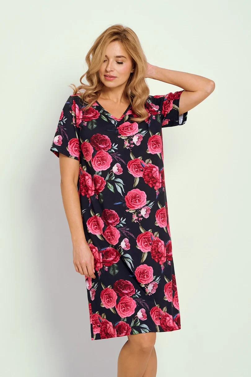 Noční košile s krátkými rukávy ze vzorované bavlny, s výstřihem, v délce ke kolenům.