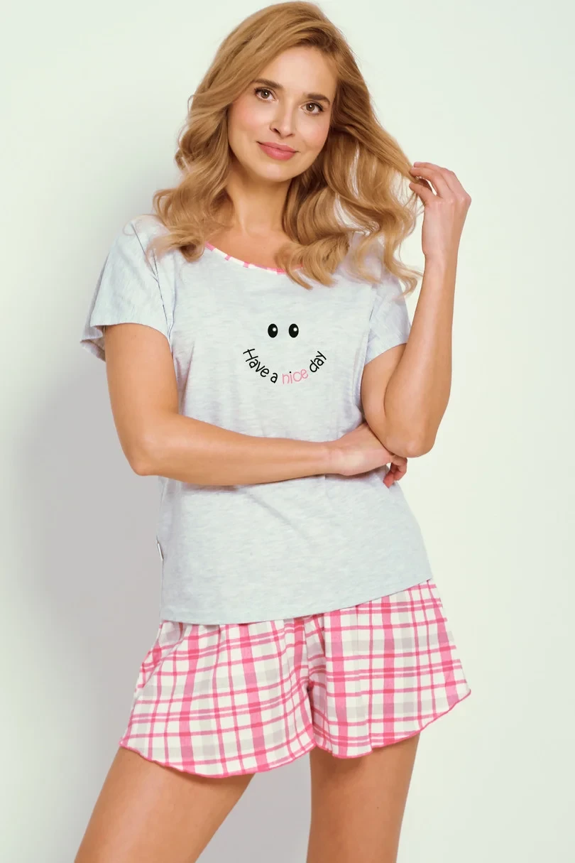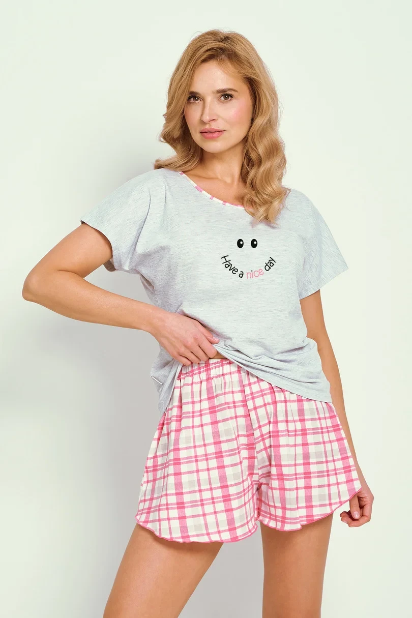 Dámské pyžamo s krátkým rukávem z měkké bavlny, jednobarevná halenka s jemným potiskem, kulatý výstřih, krátké kostkované šortky