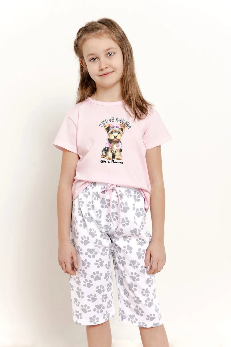Dívčí letní pyžamo Pixie od značky Taro je ideální volbou pro teplé noci. Je vyrobeno ze 100% kvalitní bavlny a nabízí maximální pohodlí a volnost pohybu. Souprava se skládá z trička s krátkým rukávem, které zdobí barevný potisk, a vzorovaných kalhot s rybím copem, které dodávají šarm a lehkost. Díky pečlivému zpracování a měkkému materiálu je pyžamo šetrné k dětské pokožce a umožňuje jí dýchat. Baleno v plastovém sáčku - skvělé jako dárek!