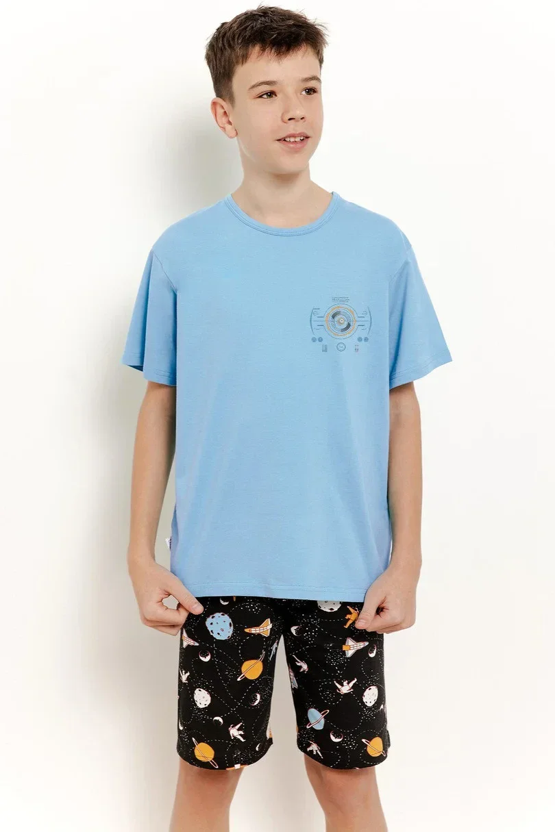 Letní noci mohou být ještě zábavnější s chlapeckým pyžamem Spencer, které je vyrobeno ze 100% měkké a prodyšné bavlny. Modré tričko s krátkým rukávem zdobí decentní potisk na hrudi, který působí moderně, a je doplněno krátkými šortkami s výrazným potiskem vesmírných motivů - planet, raket a astronautů - ideální volba pro malé dobrodruhy a milovníky pohodlí! Pyžamo je baleno v plastovém sáčku - ideální na dárek nebo na výlet.