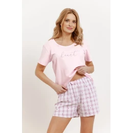 Piżama składa się z gładkiej koszulki z krótkim rękawem i półokrągłym dekoltem, który dodaje jej subtelnej elegancji. Do kompletu dołączone są krótkie, wzorzyste spodenki, które przyciągają uwagę modnym wzorem oraz uroczą kokardką w pasie. Ten zestaw to idealne połączenie kobiecego stylu i wygody – idealny na ciepłe noce!