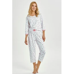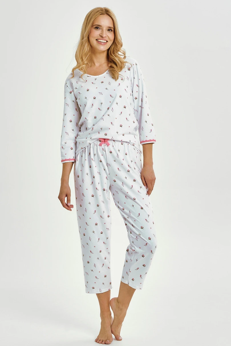 Dámské pyžamo Elodie 3432 je jemnou a ženskou volbou pro klidné noci. Je celé vyrobené z měkké a prodyšné bavlny, takže poskytuje pohodlí a volnost pohybu. Košilka s 3/4 rukávy je zdobená drobným květinovým potiskem a krajkovým lemem na manžetách, který dodává romantický nádech. Souprava je doplněna kalhotami v rybářském stylu s ozdobnou mašlí v pase. Ideální na jaro, léto nebo jako stylový dárek pro někoho blízkého.