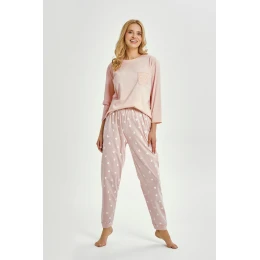 Dámské pyžamo Nori 3442 je kombinací pohodlí, elegance a jemného půvabu.Je vyrobeno ze 100% kvalitní bavlny, která zajišťuje pohodlný spánek a prodyšnost po celou noc.Jednotné tričko se 7/8 rukávy má klasický kulatý výstřih a ozdobnou krajkovou kapsu, která dodává ženský nádech.Soupravu doplňují dlouhé kalhoty ve tvaru srdce, zakončené pohodlnými žebrovanými manžetami a elastickým pasem.Ideální pro chladnější večery a rána.