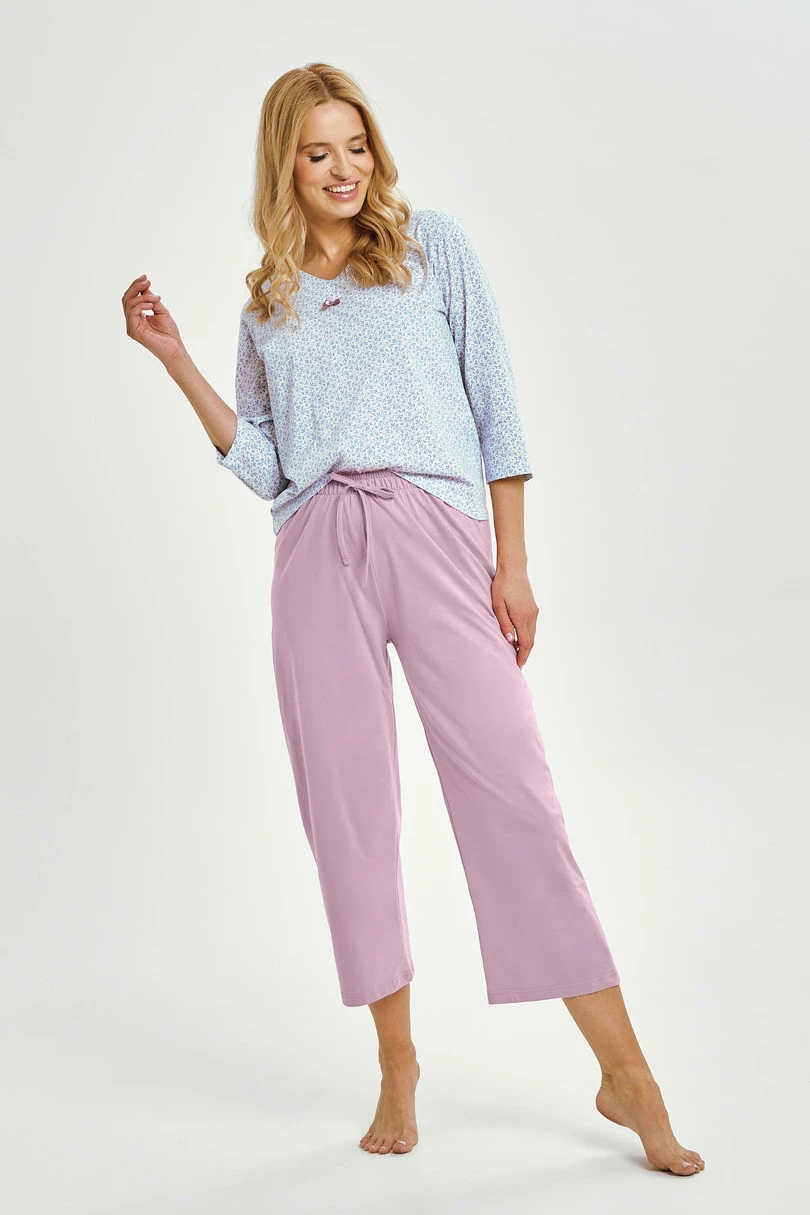 Dámské pyžamo Debora 3448 je elegantní a pohodlný komplet, který je navržen tak, aby zajistil pohodlný spánek a stylový vzhled.Tričko s 3/4 rukávy je vyrobeno z měkké vzorované bavlny a má výstřih do V, zdobený půvabnou saténovou mašlí.Kalhoty culotte mají rovné 7/8 nohavice a jsou pevné, s pohodlnou šňůrkou v pase pro dokonalé přizpůsobení.Celý komplet je vyroben ze 100% bavlny, měkké a prodyšné.