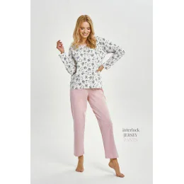 Dlouhá dámská pyžamová souprava Martina 3451 je klasická souprava pro ženy, které ocení přírodní materiály a pohodlí každou noc. Je vyrobena ze 100% kvalitní bavlny, je příjemná na dotek a prodyšná. Tričko s dlouhými rukávy zdobené drobným květinovým motivem dodává prádlu jemný, ženský půvab. Kulatý výstřih zakončený jednotným lemem poskytuje estetické zakončení. Dlouhé kalhoty jednotného rovného střihu s pružným pasem zaručují pohodlí a volnost pohybu během spánku.