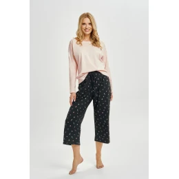 Dlouhé dámské pyžamo IRENE 3457 od značky Taro je kombinací klasiky, pohodlí a okouzlujícího designu. Je vyrobeno výhradně z přírodní, 100% bavlny, takže poskytuje příjemné zahalení a prodyšnost během spánku. Tričko s dlouhými rukávy je ideální pro chladnější večery, zatímco kalhoty v délce 7/8 zdobené jemným květinovým vzorem dodávají ženský nádech. Figurínová šňůrka v pase plní dekorativní funkci. Ideální volba pro ženy, které si cení pohodlí a jemné estetiky.