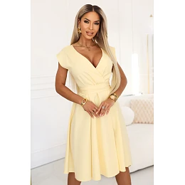 348-13 SCARLETT rozšířené midi šaty s obálkovým výstřihem a páskem - máslově žluté