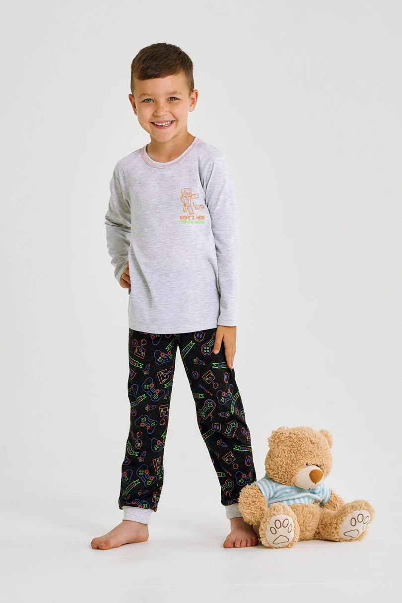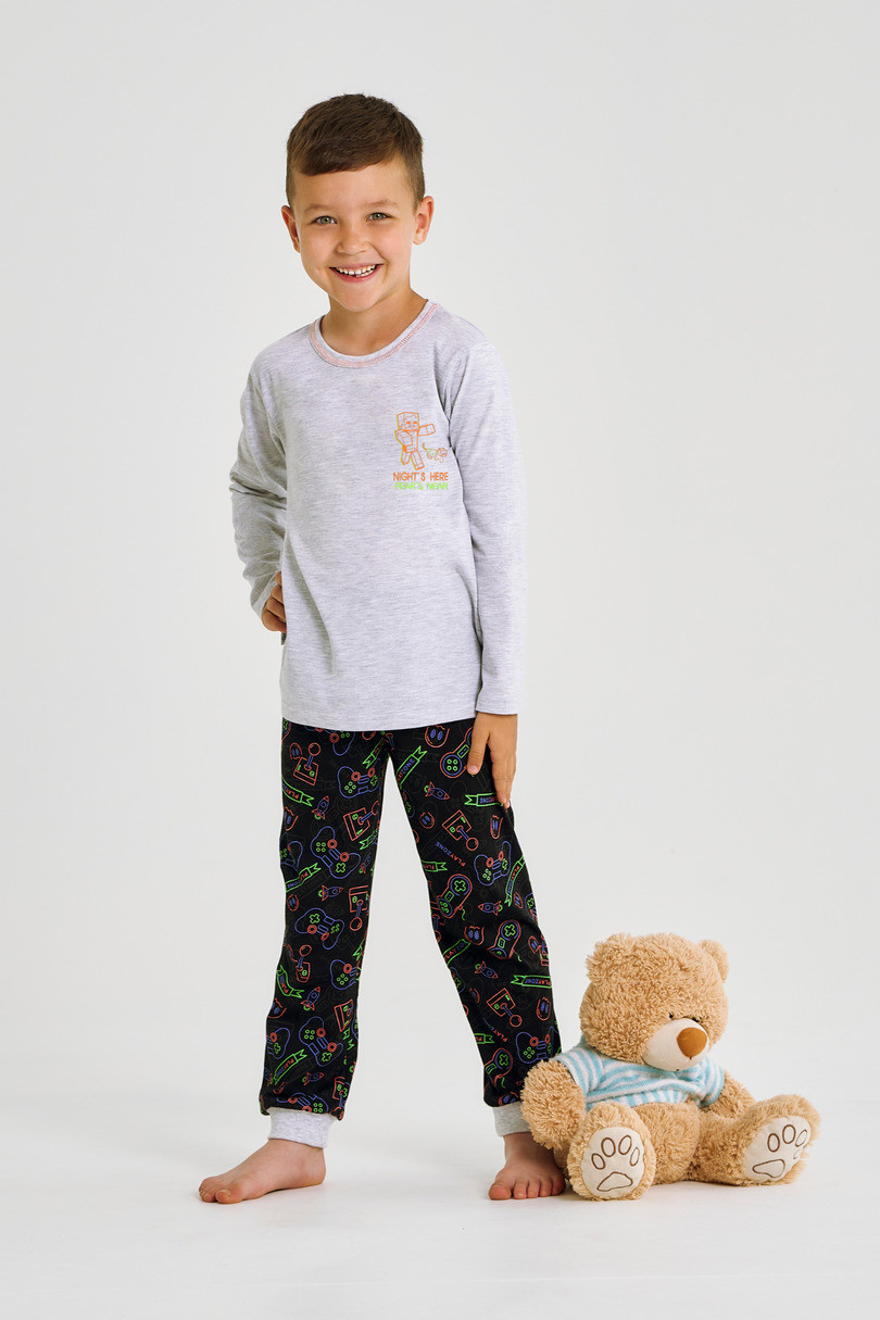 Chlapecká pyžamová souprava Taro 3497 Liam je praktická a pohodlná souprava, vyrobená z kvalitní přírodní bavlny. Tričko s dlouhými rukávy zdobí na přední straně módní potisk, který dodává soupravě moderní chlapecký nádech. Soupravu doplňují dlouhé kalhoty se zajímavým vzorovaným designem, zakončené elastickými manžetami. V pase je pohodlná guma, která zajišťuje dokonalé přizpůsobení a pohodlí při spánku nebo domácím odpočinku. Model je k dispozici ve velikostech 92-116 a je ideální volbou pro mladší chlapceór, kteří ocení pohodlí a volnost pohybu.