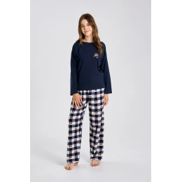 Piżama dziewczęca ASTRID 3503 to wyjątkowe połączenie stylu, komfortu i jakości – stworzona z myślą o nastolatkach ceniących wygodę i modne wzory. Komplet składa się z koszulki z długim rękawem o luźnym kroju i półokrągłym dekolcie, ozdobionej subtelnym nadrukiem na przodzie, oraz długich spodni w modną kratkę wykonanych z miękkiej, ciepłej flaneli bawełnianej. Całość uszyta w 100% z naturalnej bawełny, co zapewnia oddychalność i komfort przez całą noc. Elastyczna gumka w pasie nie uciska i dopasowuje się do sylwetki. Piżama ASTRID to idealny wybór na chłodniejsze wieczory – praktyczna, stylowa i przyjemna w noszeniu.