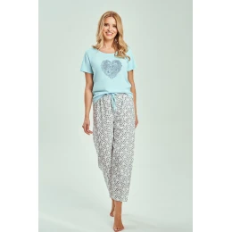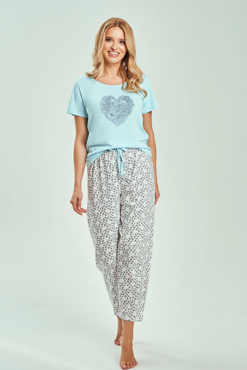 Piżama damska 3513 ALESSIA to stylowa i wygodna propozycja dla kobiet, które cenią naturalne materiały oraz modny, kobiecy design. Wykonana w 100% z wysokiej jakości bawełny, jest miękka, przewiewna i przyjemna dla skóry, zapewniając komfort snu oraz relaksu w domowym zaciszu. Koszulka z krótkim rękawem i półokrągłym dekoltem doskonale układa się na sylwetce, a ozdobny nadruk z przodu dodaje całości nowoczesnego charakteru.