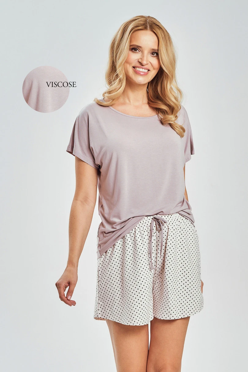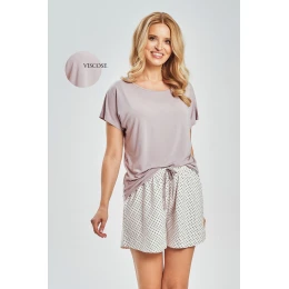 Piżama damska 3516 MARCELLA TARO to elegancka i niezwykle komfortowa propozycja dla kobiet ceniących wysoką jakość materiałów oraz subtelny, nowoczesny styl. Luźna koszulka w modnym kolorze mocca została wykonana z wyjątkowo miękkiego modalu z dodatkiem elastanu, dzięki czemu doskonale dopasowuje się do sylwetki, jest lekka, oddychająca i niezwykle przyjemna w dotyku. Krótki rękaw oraz półokrągły dekolt podkreślają swobodny, kobiecy charakter kompletu.