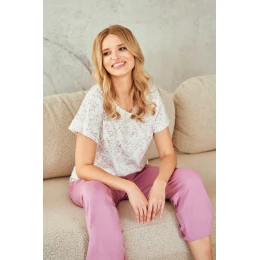 Dámské pyžamo 3542 MARIELLA S-XL TARO je elegantní a pohodlná noční souprava kombinující přírodní bavlnu s měkkou viskózou. Tričko s krátkým rukávem ze 100% prodyšné bavlny poskytuje příjemné nošení a pohodlí po celou noc. Zdobí ho jemný květinový potisk a je zakončeno kulatým výstřihem, který dodává celé soupravě ženský půvab. Jednoduché kalhoty v délce 7/8 z měkké, elastické viskózy (93 % viskózy, 7 % elastanu) se dokonale přizpůsobí postavě a zaručují volnost pohybu. V pase jsou opatřeny pohodlnou gumičkou s ozdobnou mašlí, která podtrhuje jemný styl soupravy. Pyžamo je baleno v plastovém sáčku - ideální pro spánek i domácí relaxaci.